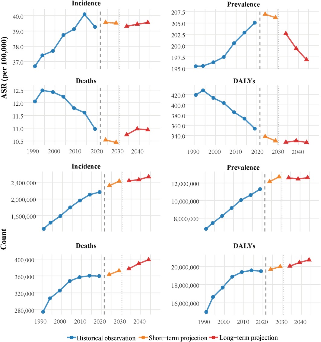 Historical trends and future projections of early-onset IHD burden from 1990 to 2046. APC model projections showing historical observations (1990–2021) and future trends through 2046 for both age-standardized rates (upper panels) and absolute counts (lower panels). ASIRs are projected to continue rising to 40.3 (95% UI: 40–40.6) per 100,000 by 2046, with absolute incident cases reaching 2.58 (95% UI: 2.56–2.59) millions globally. ASPRs are projected to reach 198.1 (95% UI: 197.5–198.6) per 100,000 by 2046, corresponding to 12.7 (95% UI: 12.66–12.73) millions prevalent cases worldwide. ASMRs show a continued declining trajectory to 11.4 (95% UI: 11.3–11.5) per 100,000 by 2046, though absolute deaths are expected to increase to 0.42 (95% UI: 0.41–0.42) million cases. ASDRs are projected to stabilize around 337.7 (95% UI: 337.3–338.4) per 100,000 by 2046, with total projected DALYs reaching 21.43 (95% UI: 21.4–21.47) millions years. The vertical dashed line at 2021 separates historical observations from projections, with short-term (2022–2031) and long-term (2032–2046) projection periods indicated by different colors. The model validation demonstrated satisfactory predictive performance with MAPE of 3.76% for ASIRs (correlation coefficient: 0.995), 2.06% for ASPRs (correlation coefficient: 0.996), 7.14% for ASMRs (correlation coefficient: 0.998), and 4.24% for ASDRs (correlation coefficient: 0.997) using out-of-sample prediction (training: 1990–2011, validation: 2012–2021). The UIs shown in the projections capture both parameter uncertainty and natural variation in disease occurrence through bootstrap resampling methods. IHD, ischemic heart disease; APC, age-period-cohort; ASIR, age-standardized incidence rate; ASPR, age-standardized prevalence rate; ASMR, age-standardized mortality rate; ASDR, age-standardized DALY rate; DALYs, disability-adjusted life years; UI, uncertainty intervals; MAPE, mean absolute percentage error; RMSE, root mean square error.