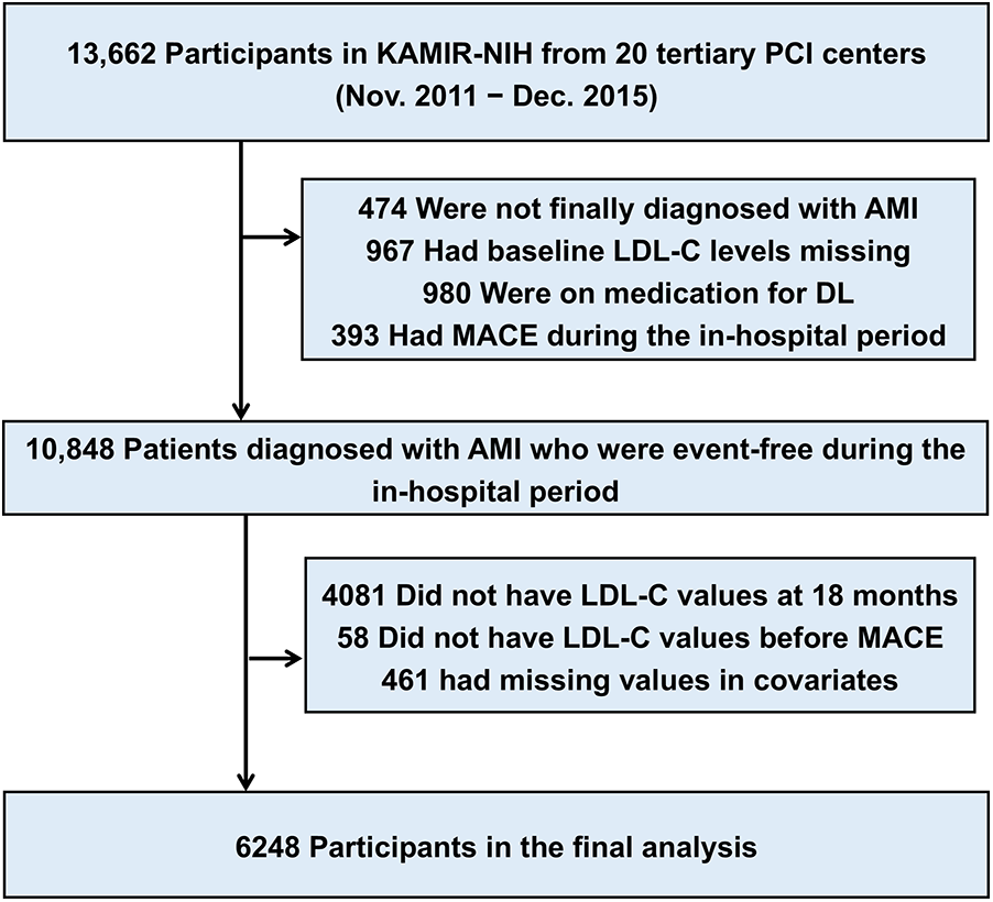 AMI, acute myocardial infarction; KAMIR, Korea Acute Myocardial Infarction Registry; LDL-C, low-density lipoprotein cholesterol; MACE, major adverse cardiovascular events; NIH, National Institute of Health.
