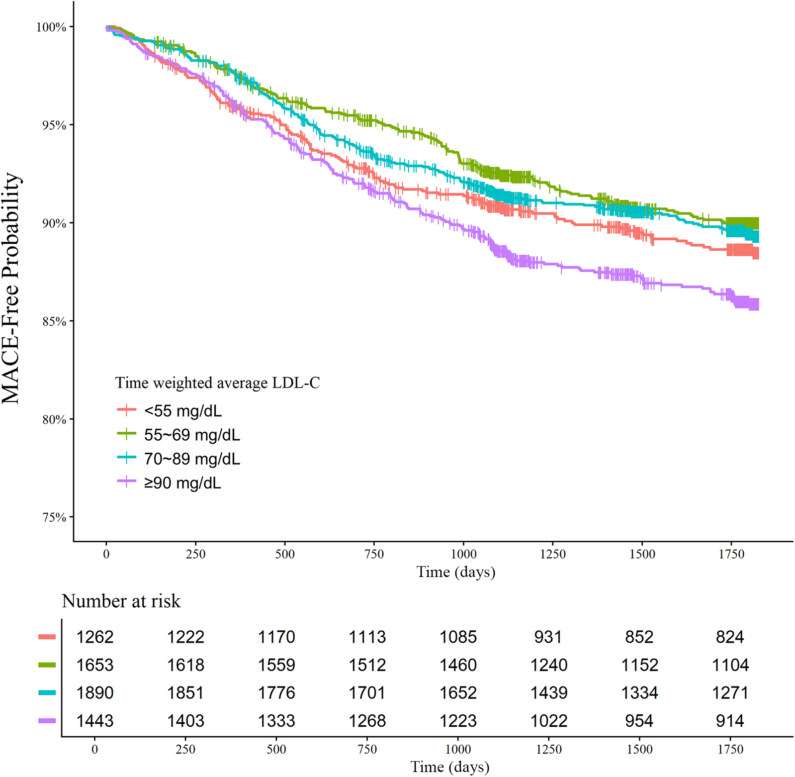 Absolute follow-up low-density lipoprotein cholesterol (LDL-C) strata and major adverse cardiovascular events (MACE) at 5 years. Kaplan–Meier curves for MACE over 5 years according to the follow-up LDL-C strata are shown. The MACE outcome was a composite of nonfatal stroke, nonfatal myocardial infarction, repeat revascularization, and all-cause death.