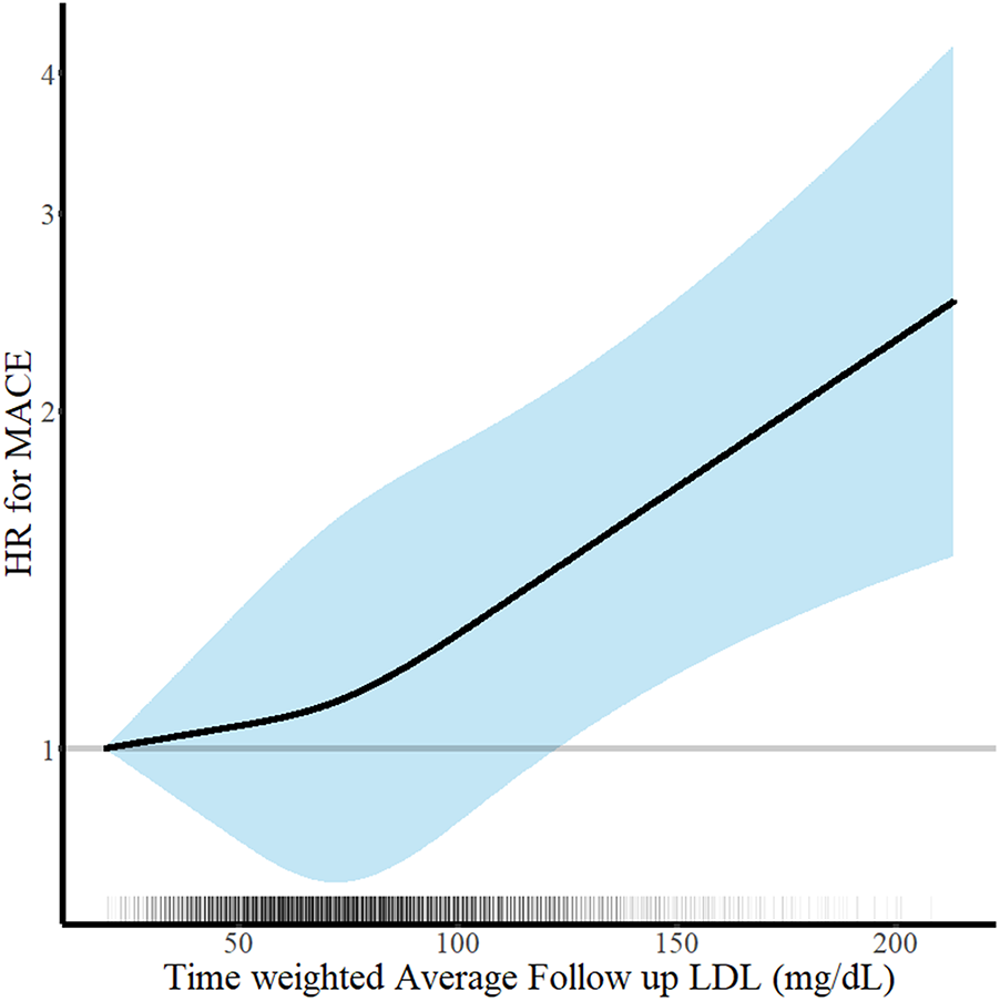 Continuous absolute follow-up low-density lipoprotein cholesterol (LDL-C) levels and risk of major adverse cardiovascular events (MACE) at 5 years. Hazard ratios for MACE at 5 years according to the continuous follow-up time-weighted average LDL-C levels are shown. Adjustments were performed for age, sex, body mass index, hypertension, diabetes mellitus, current smoker status, family history of premature coronary artery disease, previous myocardial infarction, previous myocardial revascularization, ST-elevation myocardial infarction diagnosis, and statins medication. Solid lines and shaded areas indicate hazard ratios (HRs) and 95% confidence intervals (CIs), respectively.