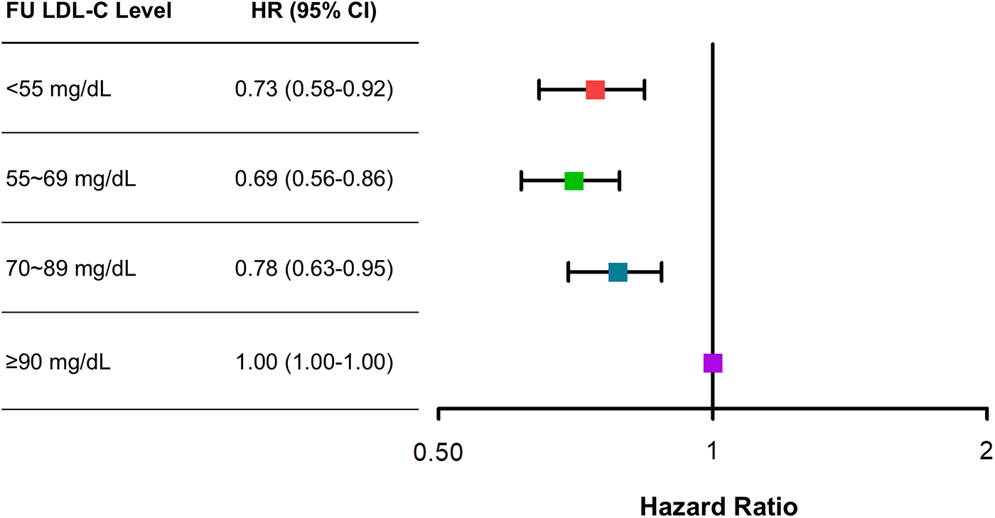 Adjusted risk of categorical absolute follow-up low-density lipoprotein cholesterol (LDL-C) strata for major adverse cardiovascular events (MACE) at 5 years. Adjusted hazard ratios (HRs) for MACE at 5 years with LDL-C ≥90 mg/dL as the reference. Cox regression analysis using the enter method was conducted.