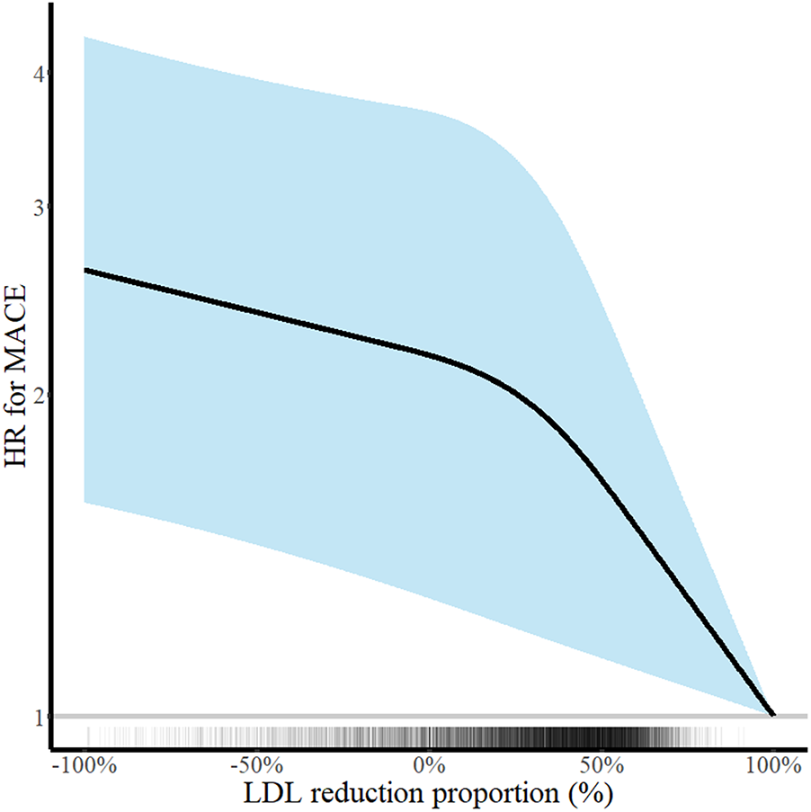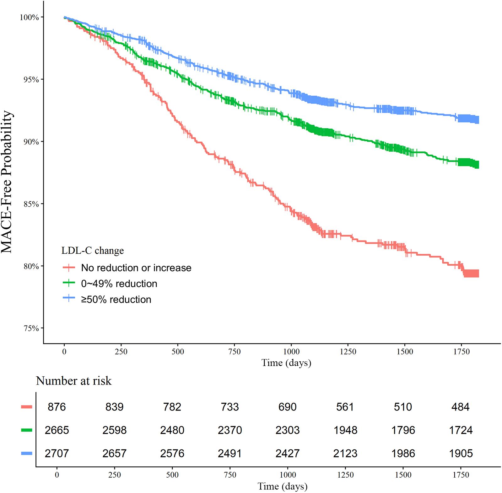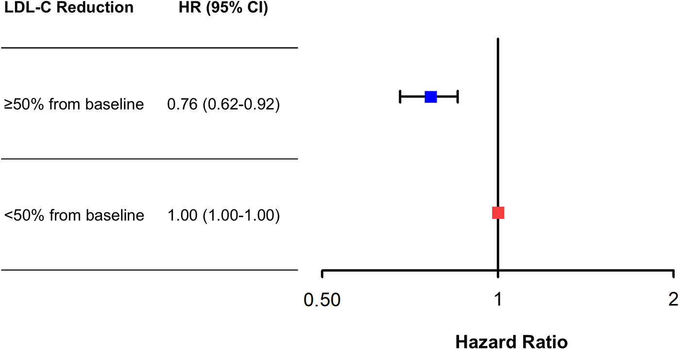 In the analysis of absolute follow-up time-weighted average LDL-C levels (<55, 55–69, 70–89, and ≥90 mg/dL), there was a U-shaped trend of MACE incidence (10.8% vs. 9.3% vs. 10.0% vs. 13.2%, P = 0.003). In the analysis of the percentage LDL-C reduction from baseline, greater reductions were associated with lower MACE risk. In a multivariable Cox time-to-event analysis with LDL-C < 50% reduction from baseline as the reference, ≥50% LDL-C reduction from baseline was independently associated with a decreased incidence of MACE (adjusted hazard ratio, 0.76; 95% confidence interval, 0.62–0.92).
