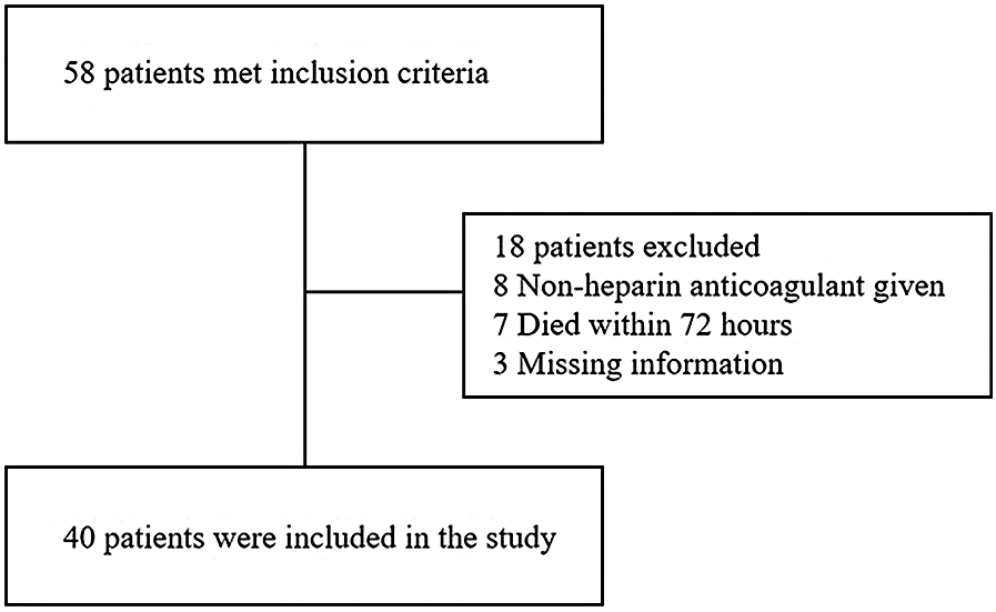 A single-center retrospective analysis was conducted on 58 adult patients who received VA-ECMO treatment between March 2023 and April 2025 in the intensive care unit (ICU) of Jinhua Hospital Affiliated with Zhejiang University. The inclusion criteria for the cohort were (i) VA-ECMO support for ≥72 h, (ii) age ≥18 years, and (iii) use of heparin for anticoagulation. The exclusion criteria included (i) age <18 years, (ii) death within 72 h, (iii) patients transferred from other hospitals, (iv) use of anticoagulants other than heparin or no heparin infusion during ECMO support, (v) missing data or fewer than 18 paired ACT and aPTT measurements, and (vi) pregnancy. Ultimately, 40 patients were included in the study. Given the retrospective nature of the research, written informed consent for participation was not required for the use of clinical specimens. The study adhered to the Declaration of Helsinki and received approval from the Ethics Committee of Jinhua Hospital Affiliated to Zhejiang University (Approval No. 2023-28).