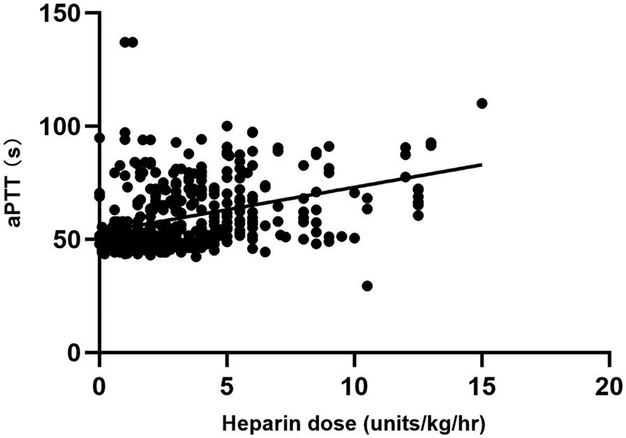A total of 446 matched pairs of ACT, aPTT, and heparin dose results were obtained from the 40 patients included in the study (22 in the ACT-target group and 18 in the aPTT-target group). Pearson correlation analysis was conducted to examine the relationships between matched ACT, aPTT, and heparin dosage. Heparin dose showed a positive correlation with aPTT (r = 0.412, P < 0.001) and a negative correlation with blood flow (r = −0.329, P < 0.001). ACT exhibited a weak correlation with aPTT (r = 0.123, P < 0.001), while no correlation was observed between heparin dose and ACT (Figures 2, 3).