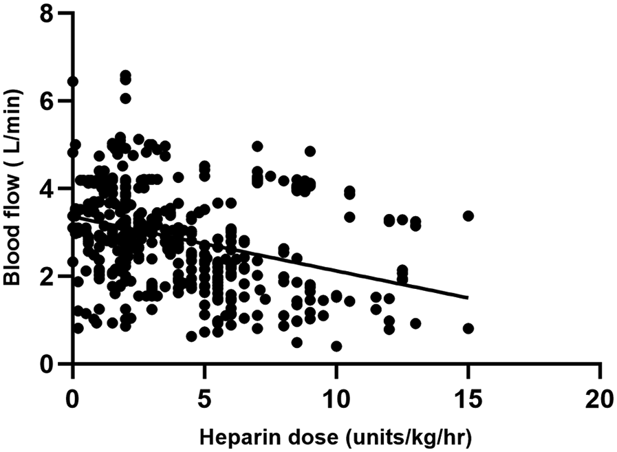 | Heparin dose and blood flow | −0.396 | 0.001* | −0.375 | 0.001* |