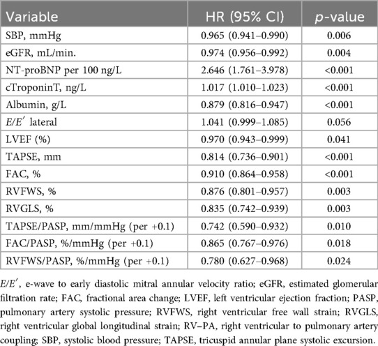 Table 3 reports on the univariate Cox regression analysis of clinical, laboratory, and echocardiographic parameters associated with mortality. In univariable Cox regression, SBP, estimated glomerular filtration rate (eGFR), NT-proBNP, troponin T, albumin, LVEF, TAPSE, FAC, RVFWS, RVGLS, and all RV–PA coupling surrogates were significantly associated with mortality. Among the RV–PA coupling surrogates, all three (TAPSE/PASP, FAC/PASP, and RVFWS/PASP) were associated with mortality, but TAPSE/PASP provided the strongest and most robust prognostic discrimination across analytic approaches.