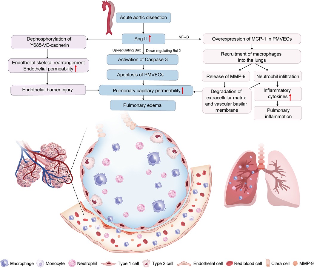 Mechanistic studies reveal Ang II drives lung injury through two parallel pathways: AT1-R-mediated macrophage recruitment (demonstrated by attenuated pulmonary infiltration following AT1-R blockade despite persistent MMP-9 elevation) and NF-κB-dependent upregulation of MCP-1 in PMVECs, which drives chemotaxis of MMP-9-expressing macrophages (28, 29). Macrophages recruited via these pathways exacerbate vascular permeability through MMP-9-mediated endothelial damage and neutrophil infiltration (32). Concurrently, upregulated MCP-1 induces PMVECs apoptosis via B-cell lymphoma-2 (Bcl-2)/BCL-associated X (Bax) imbalance and caspase-3 activation, further compromising pulmonary microvascular integrity (29). Although the aforementioned studies did not delineate the relative contributions of Ang II-AT1-R binding and MCP-1 elevation in driving MMP-9-expressing macrophages recruitment to the lungs, establishing MCP-1 and MMP-9 as key mediators of Ang II-driven lung injury during the preoperative phase of AAD supports their potential as early predictive biomarkers and therapeutic targets. In addition, Wu et al. found that the expression level of vascular endothelial cadherin (VE-cadherin) is closely related to the apoptosis and skeletal rearrangement of PMVECs induced by Ang II, while the dephosphorylation of Y685-VE-cadherin is involved in Ang Ⅱ-mediated pulmonary microvascular endothelial barrier injury (30, 33). These discoveries also sheds new light on the mechanisms and potential interventions for AAD-inducedARDS (Figure 1).