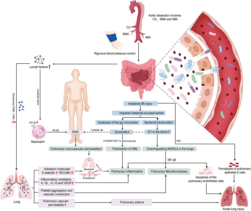 While the mechanisms of intestinal I/R injury contributing to lung injuryhave been elucidated in animal models and in vitro studies, these findings have yet to be further validated in experimental AAD models or more clinical mechanistic investigations. Previous studies have suggested an association between aortic dissection involving the celiac trunk/mesenteric arteries and preoperative hypoxemia (7), potentially mediated by gut-originated inflammation. Furthermore, emerging researches have demonstrated that intestinal barrier dysfunction occurring subsequent to AAD is implicated in SIR and lung injury providing preliminary insights into the interplay mechanism between gut and lung injuries following AAD (68, 76, 77). However, the scientific validity and methodological rigor of the aforementioned study design and its conclusions warrant critical scrutiny. Notable limitations include the absence of controlled exclusion of confounding factors (e.g., systemic hypoperfusion, direct gastrointestinal vascular compromise by dissection) and incomplete assessment of I/R injury biomarkers (e.g., oxidative stress markers, lactate, creatine kinase, lactate dehydrogenase). Consequently, the temporal relationships and pathophysiological interplay among SIR, intestinal injury, and lung injury following AAD require further mechanistic exploration.