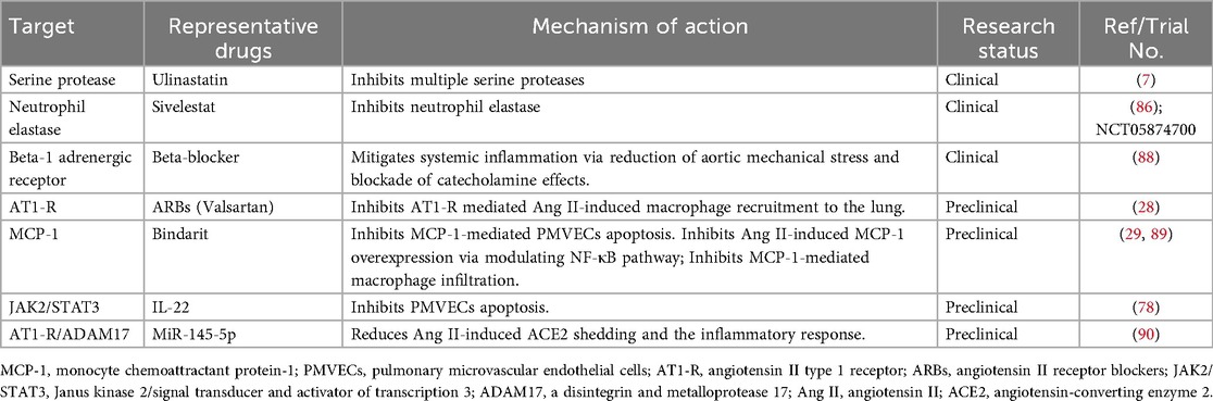 Beyond established clinical interventions, preclinical studies have revealed several potential pharmacological agents for mitigating AAD-induced lung injury. AT1-R blocking agent (Valsartan) reduces macrophage accumulation and alleviates lung injury, whereas downstream MMP inhibition mitigates injury without altering macrophage influx, which underscores the therapeutic superiority of targeting the upstream AT1-R (28). Bindarit, an MCP-1 inhibitor, alleviates Ang II-induced ALI by suppressing NF-κB-mediated MCP-1 production in hPMVECs, thereby limiting macrophage recruitment (89). In addition, it directly protects these cells from apoptosis by regulating the Bax/Bcl-2 ratio and caspase-3 activation (29). In mouse models confirmed that IL-22 alleviates Ang II-induced ALI, and further cellular assays revealed that this protective effect is mediated through inhibition of the JAK2/STAT3 signaling pathway, thereby reducing apoptosis in PMVECs (78). At the regulatory RNA level, MiR-145-5p reduces Ang II-induced ACE2 shedding and the inflammatory response in alveolar epithelial cells by targeting a disintegrin and metalloprotease 17 (ADAM17) and inhibiting the AT1R/ADAM17 pathway (90). Beyond these pathways, inhibition of the HMGB1 pathway, an emerging strategy with demonstrated efficacy in preclinical models of sepsis and intestinal I/R-related ALI (39, 91), represents another potential avenue for disrupting upstream inflammatory cascades in AAD. It is crucial to emphasize that the evidence for all these targets is derived from animal models and in vitro systems, which cannot fully replicate human pathophysiology. This translational gap necessitates future studies that prioritize validation in human lung tissues or more physiologically relevant animal models. Investigating combinatorial approaches (e.g., co-targeting MCP-1 and ADAM17) and evaluating the translational potential of advanced modalities like miR-145-5p or IL-22-based biologics are critical next steps (Table 1).