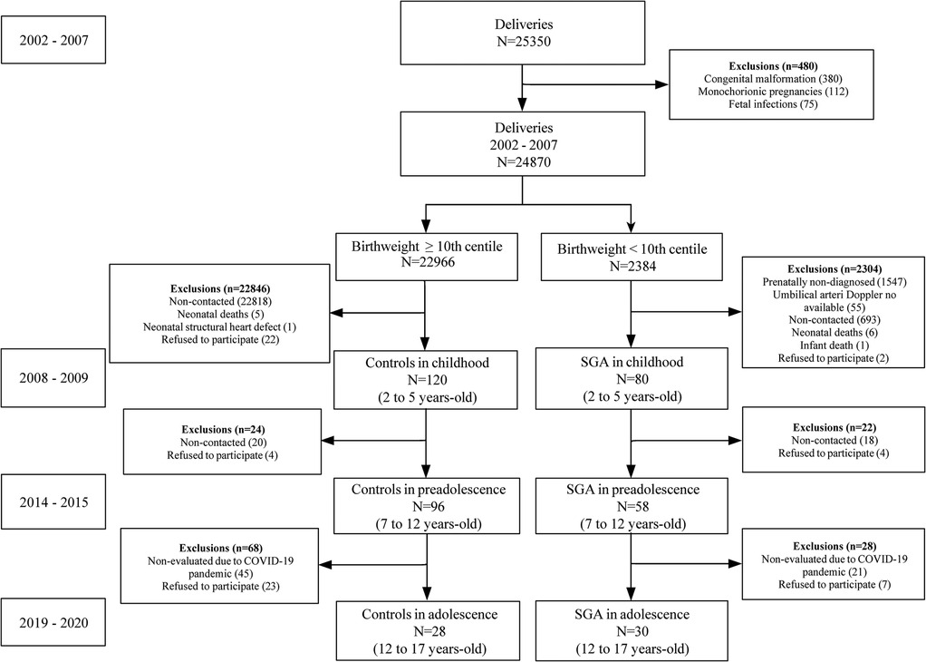 Our aim was to study the cardiovascular temporal evolution associated with SGA status. Thus, we planned a follow-up of a perinatal cohort from preadolescence into adolescence, including echocardiography and an exercise test.