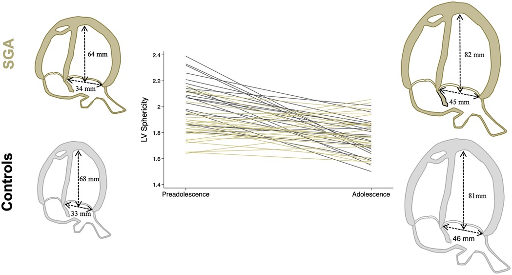 Figure 2. Individual change in LV sphericity during the follow-up period among the study groups (controls in gray and SGA in khaki). Illustrative cardiac figures, including mean average LV length and basal diameter in each study group. LV, left ventricular; SGA, small for gestational age.
