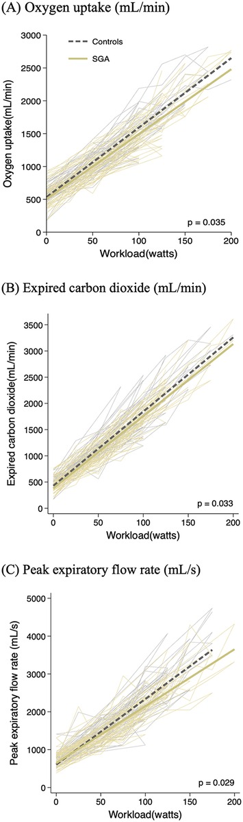 Figure 3. Individual and average curves of oxygen uptake (A), expired carbon dioxide (B), and peak expiratory flow rate (C) plotted according workload during exercise in controls (gray lines) and SGA (khaki lines) adolescents. p-value for estimated overall difference at each level of exercise in SGA compared to controls using multilevel mixed-effects linear regression adjusted for age, sex, and body surface area. SGA, small for gestational age.