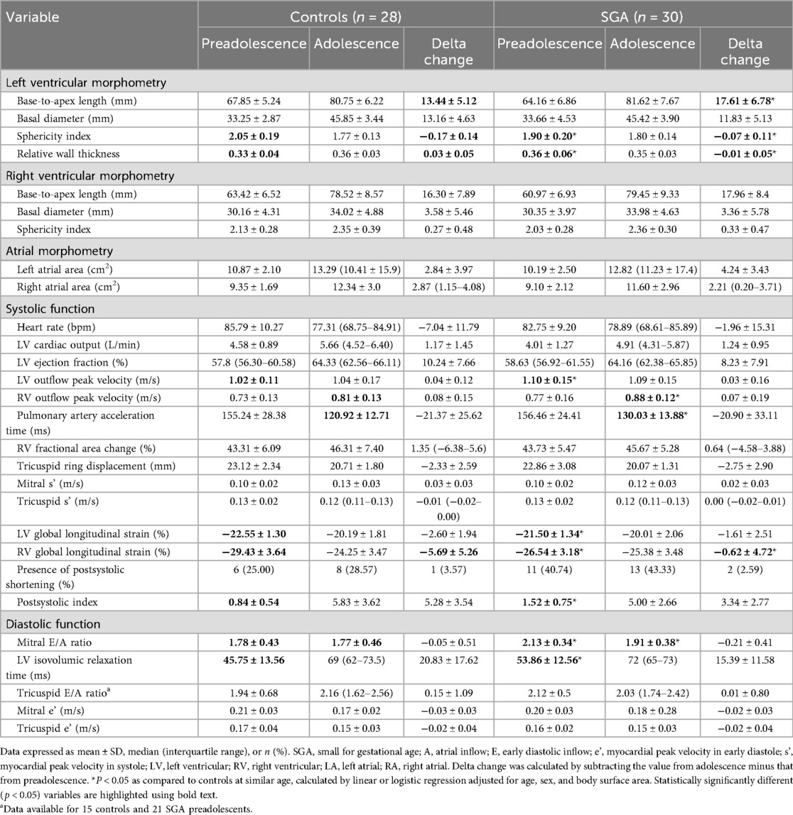 To estimate the temporary evolution of the echocardiographic results, delta change was calculated by subtracting the value from adolescence minus that from preadolescence of each individual.