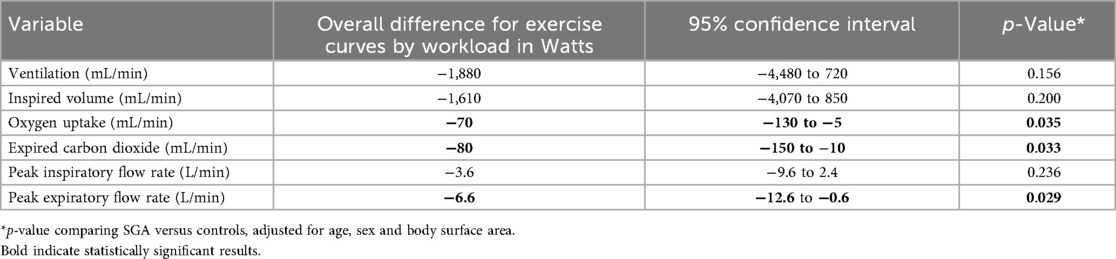 An exercise stress test was performed in all adolescent participants. Respiratory baseline characteristics were similar between groups (Supplementary Table S3). The estimated overall difference between groups during exercise is shown in Table 2. Individual traces of the respiratory results as a function of the workload curves (respiratory results according to each workload slope) in SGA individuals and controls with 95% confidence intervals are shown in Figure 3. Significant differences were observed in SGA adolescents during exercise with reduced oxygen uptake [−70 mL/min (−130 to −5 mL/min)], expired CO2 [−80 mL/min (−150 to −10 mL/min)], and peak expiratory flow rate [−110 mL/s (−210 to −10 mL/s)] compared to controls.