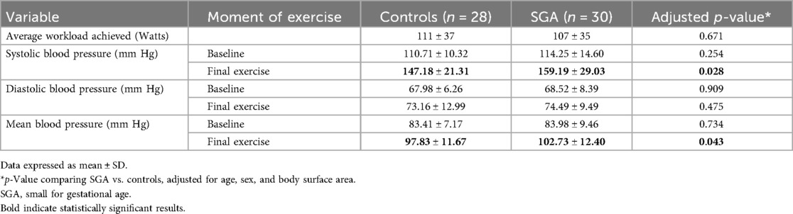 The present study suggests lower exercise tolerance in adolescents born SGA, with reduced oxygen consumption, expired carbon dioxide, and peak expiratory flow rate at each exercise level compared with participants of normal birth weight. To our knowledge, this is the first study to report the cardiopulmonary response of SGA adolescents during incremental exercise testing. Our data align with previous studies showing reduced exercise capacity in young adults born with low birth weight (15, 40, 41). We have recently demonstrated similar findings in a large cohort of young adults born SGA (15). Harris et al. reported that young adults born very prematurely and growth-restricted had lower mean lung function and exercise capacity than those born prematurely but with appropriate birth weight (40). Yang et al. also found reduced exercise capacity in adults with very low birth weight compared with term-born controls, independent of prematurity or bronchopulmonary dysplasia (41). The poorer exercise test results observed here are consistent with epidemiological evidence demonstrating a higher cardiovascular risk in adults born SGA (5, 42–44). We hypothesize that exercise testing acts as physiological stressor, revealing a suboptimal cardiorespiratory performance in this population. We also observed higher systolic blood pressure at peak exercise, which may be explained by reduced arterial distensibility (45, 46) and/or an exaggerated sympathetic tone response during exercise (47). However, this remains speculative, as arterial stiffness and sympathetic tone were not directly assessed. It is possible that SGA adolescents are unable to increase stroke volume effectively—through deformation and/or heart rate changes—potentially due to right heart limitations, as previously suggested in our adult study (15). This would indicate that overall cardiovascular performance during exercise is compromised in SGA adolescents.