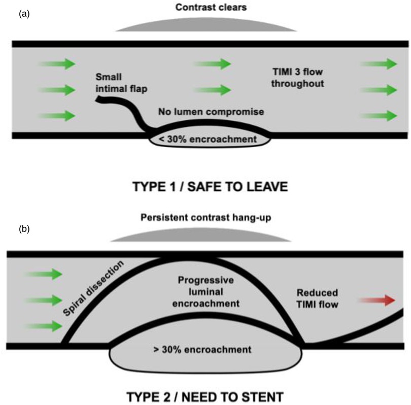 Figure 1. A new and simplified approach to coronary dissection classification. (a) Type 1 (safe to leave) dissection. This comprises dissections TIMI 3 flow with the presence of an intimal flap without luminal encroachment or a parallel-tract dissection that appears angiographically outside the vessel wall and from which contrast clears within 30 seconds. (b) Type 2 (vessel-threatening/“need to stent”) dissection. This category includes dissections with reduced TIMI flow, dissections that result in progressive luminal encroachment, spiral dissections, or dissections with persistent contrast in a parallel tract that does not clear within 30 seconds.