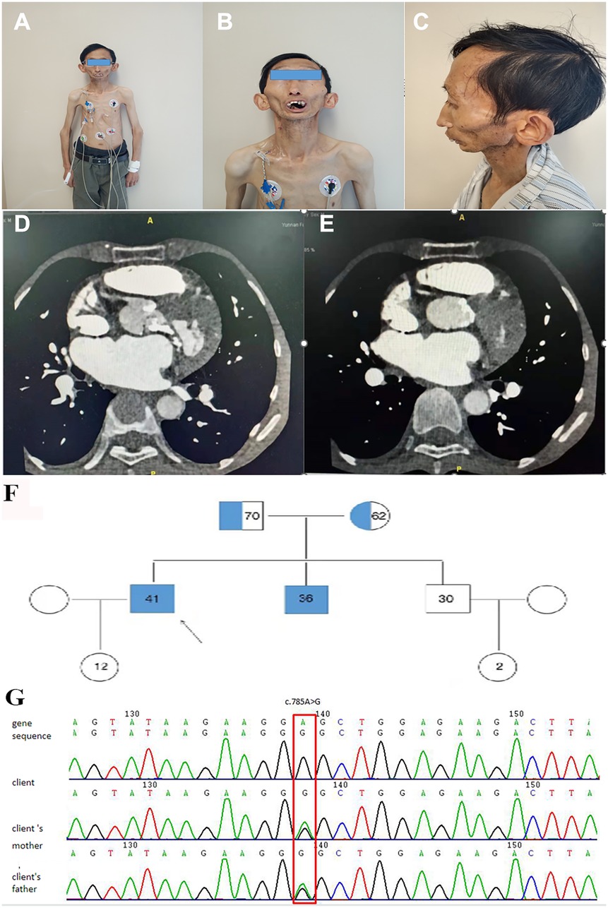 A 41-year-old Han Chinese male, the product of a consanguineous marriage, presented with exertional dyspnea and fatigue, symptoms attributable to severe aortic valve stenosis. His medical history was significant for features characteristic of MADA, diagnosed in childhood. Physical examination revealed a markedly short stature (height: 1.2 m) and low body weight (26.5 kg). Craniofacial features included mandibular hypoplasia, dental crowding, a tapered nasal tip, and prominent scalp veins (Figures 1A–C). There was generalized lipodystrophy with striking loss of subcutaneous fat in the limbs, contrasted with relative preservation in the face and neck, accompanied by thin, atrophic, sclerodermatous skin changes (Figures 1A–C). Despite these physical abnormalities and slowed growth during adolescence following a normal birth and early development, his cognitive function was normal, having completed college and pursued a career as a physics teacher.