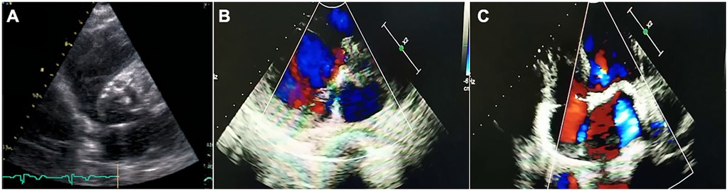 He was diagnosed with severe aortic valve calcification and stenosis at age 39 during an investigation of his symptoms. A comprehensive cardiac assessment confirmed complex valvular heart disease. Transthoracic echocardiography showed a severely stenotic aortic valve, noted to be morphologically tricuspid but with extensive calcification, leaflet thickening, and commissural fusion restricting opening (Figure 2A). Color Doppler interrogation revealed high-velocity, turbulent flow consistent with severe stenosis (peak gradient > 80 mmHg, mean gradient > 50 mmHg, calculated valve area < 0.8 cm²), accompanied by moderate mitral stenosis with regurgitation, moderate tricuspid regurgitation, and markedly elevated estimated systolic pulmonary artery pressure (84 mmHg) (Figures 2B,C). Standard laboratory investigations, including complete blood count, inflammatory markers (CRP, ESR), renal and hepatic function panels, fasting glucose, HbA1c, and serum phosphocreatine kinase, were unremarkable. Chest radiography demonstrated cardiomegaly and a distinct pyriform (pear-shaped) thoracic configuration. Cardiac computed tomography (CT) provided detailed anatomical information, confirming massive calcification involving the aortic valve leaflets, aortic annulus, and mitral valve annulus, and extending into the left ventricular outflow tract (Figures 1D,E).