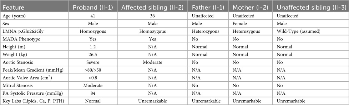 Mandibuloacral dysplasia type A (MADA) represents a rare segment of the progeroid syndromes spectrum, stemming from mutations in the LMNA gene and primarily impacting skeletal, cutaneous, and adipose tissues (11). While cardiomyopathy and conduction system disease are recognized features of certain LMNA mutations (12), severe, early-onset calcific valvular heart disease is not conventionally considered part of the MADA phenotype (12, 13). This report presents compelling evidence from two affected brothers linking the homozygous LMNA missense mutation p.Glu262Gly (c.785A > G) to such severe valvular pathology.
