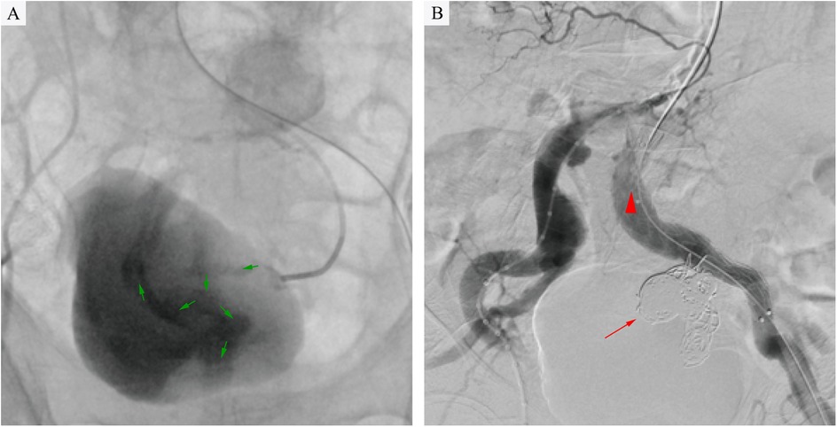 Figure 2. (A) Intraoperative angiography revealed contrast extravasation (green arrows) into the rectal lumen, confirming an internal iliac artery aneurysm-rectal fistula following selective catheterization of the left internal iliac artery aneurysm. (B) Angiography confirmed complete aneurysm exclusion after coil embolization (red arrow) and stent-graft deployment (red triangle), with no residual contrast leakage into the rectum.