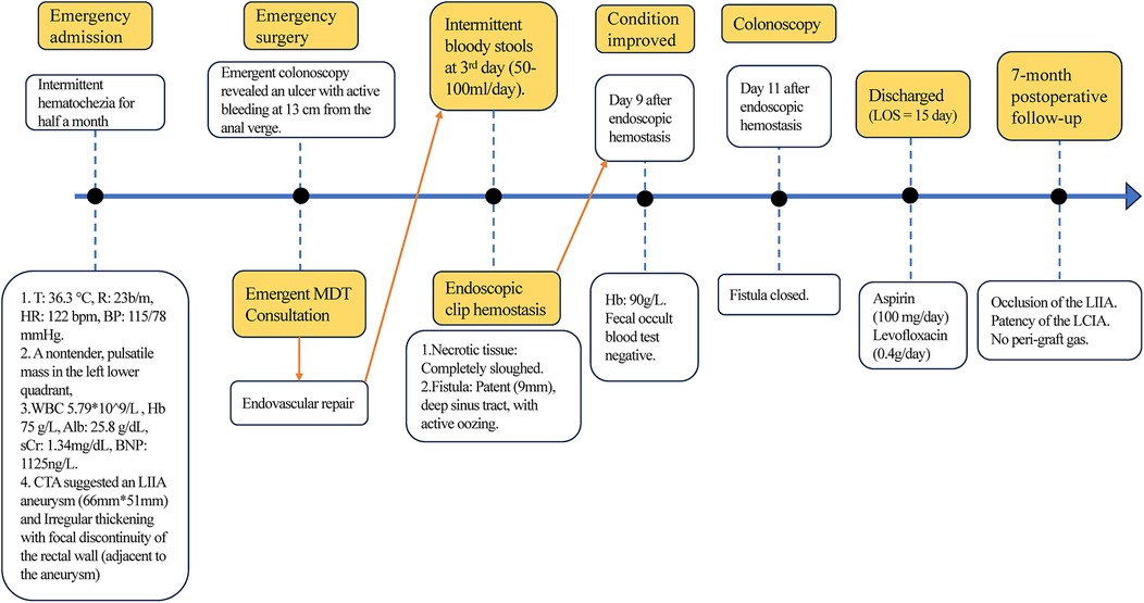 An 82-year-old male presented to the emergency department with a half-month history of intermittent hematochezia, with an estimated blood loss of 100–200 ml per episode. He also reported generalized weakness, dizziness, lower abdominal pain, and occasional passage of blood clots. The patient denied abdominal distension, diarrhea, fever, or bowel obstruction, and reported no significant recent weight change. His medical history included coronary artery disease, smoking, and COPD. There was no prior surgical or trauma history. Physical examination revealed a pulsatile mass in the left lower abdomen without significant tenderness. The extremities were cool and clammy, with poor peripheral perfusion. Vital signs on admission were: temperature 36.3°C, heart rate 122 beats/min, respiratory rate 23 breaths/min and blood pressure 115/78 mmHg. Laboratory investigations revealed anemia (hemoglobin:75 g/L; reference range: 114–154 g/L), hypoalbuminemia (albumin:25.8 g/d; reference range: 40–55 g/L), renal insufficiency (serum creatinine:1.34 mg/dl; reference range: 0.6–1.2 mg/dl) and acute heart failure (B-type natriuretic peptide: 1,125 ng/L; reference range < 226 ng/L). Other parameters were within normal limits. Computed tomographic angiography (CTA) demonstrated a 32 × 27 mm right common iliac artery aneurysm and a 20 × 27 mm left common iliac artery aneurysm. A 66 × 51 mm aneurysm was identified in the left internal iliac artery with extensive intramural thrombus (Figure 1A). Furthermore, the rectal wall showed irregular thickening with focal discontinuity along the left upper wall (Figures 1B,C), suggestive of a fistula between the left internal iliac artery aneurysm and the rectum. Emergency colonoscopy revealed an ulcer with active bleeding at 13 cm from the anal verge (Figures 1D,E); a biopsy of the surrounding tissue was obtained. The patient was diagnosed with: (1) left internal iliac artery–rectal fistula; (2) hemorrhagic shock; (3) hypoalbuminemia; (4) renal insufficiency; (5) coronary artery disease; (6) acute heart failure and (7) COPD.