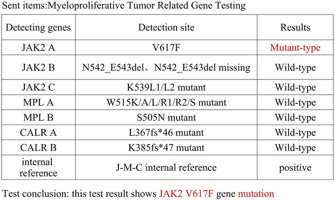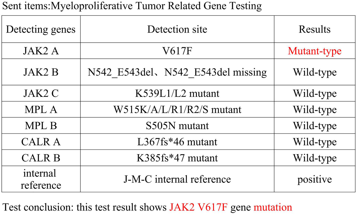 Physical examination revealed no significant abnormalities and the patient was hospitalized. Admission routine blood tests showed a platelet (PLT) count of 713 × 109/L (reference range: 125–350 × 109/L) and a white blood cell (WBC) count of 12.67 × 109/L (reference range: 3.5–9.5 × 109/L). MRI demonstrated malacic foci in the left corona radiata and basal ganglia region, as well as the right cerebellar hemisphere, along with multiple white matter hyperintensities suggestive of chronic microvascular ischemic changes. Bone marrow puncture revealed megakaryocytic hyperplasia and thrombocytosis. Cytogenetic studies, including BCR-ABL fusion gene testing and chromosome karyotype analysis, were normal. Reticulin staining (Gomori) showed grade MF-1 fibrosis. A myeloproliferative neoplasm-associated gene panel detected a JAK2 V617F mutation (Figure 1). Bone marrow biopsy confirmed these findings, showing an elevated granulocyte-to-erythroid ratio (G:E ratio) and scattered megakaryocytes with increased platelet production. The granulocyte compartment constituted 69% of the marrow cellularity. The overall bone marrow findings supported the diagnosis of Essential Thrombocythemia (ET). Following consultation with Hematology, the hydroxyurea dose was increased to 1,000 mg/day. High-dose hydroxyurea (1,000 mg/day) may exacerbate myelosuppression, and the risk of platelet plunge needs to be guarded against in combination with DAPT. To avoid excessive inhibition, platelet counts were monitored every two days until reaching the target level of less than 600 × 109/L. We used both the HAS-BLED score (2 points) and ISTH-BAT score (0 points, no history of abnormal bleeding) to further quantify bleeding risk.