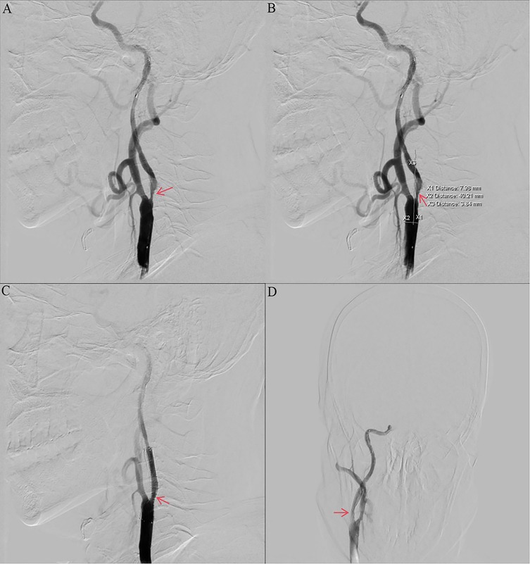 Other auxiliary investigations—including blood glucose, blood lipids, liver and renal function tests, coagulation profile, urinalysis, and thyroid antibody analysis—were unremarkable. Cardiac ultrasound and electrocardiogram findings were also normal. Vascular Surgery consultation recommended carotid endarterectomy (CEA) under general anesthesia. However, the patient and his family declined the procedure due to concerns regarding the risks associated with general anesthesia and the required neck incision. The patient decided to undergo internal carotid artery stenting under local anesthesia. Preoperative routine blood count (obtained two days prior to surgery) revealed a platelet count of 574 × 109/L. Intraoperative angiography demonstrated approximately 90% stenosis within the C1 segment of the right internal carotid artery (Figures 2A,B). The vessel diameter distal to the stenosis measured approximately 2.5 mm, while the common carotid artery diameter was approximately 7.9 mm. The stenosis was pre-dilated using a 4 mm × 30 mm LitePAC balloon inflated to 8 atmospheres(Atm). Subsequently, a 9 mm × 40 mm PROTEGE stent was successfully deployed across the stenotic segment. Post-procedural imaging showed improved antegrade flow with residual stenosis estimated at approximately 10%. Routine blood count on postoperative day 1 documented a platelet count of 415 × 109/L.