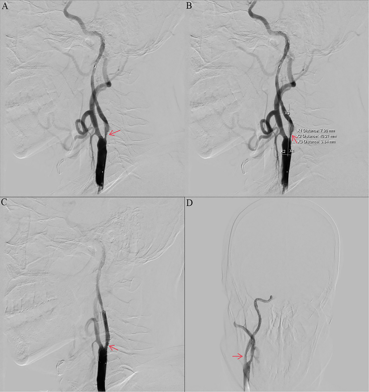 Preoperative and postoperative digital subtraction angiography. (a, b) Angiography of the right ICA before CAS showing stenosis with ulcers (NASCET 90% stenosis). (c, d) Angiography of the right ICA after CAS showing no residual stenosis and no thrombosis. ICA, internal carotid artery; CAS, carotid artery stenting; NASCET, North American Symptomatic Carotid Endarterectomy Trial; DSA, digital subtraction angiography.