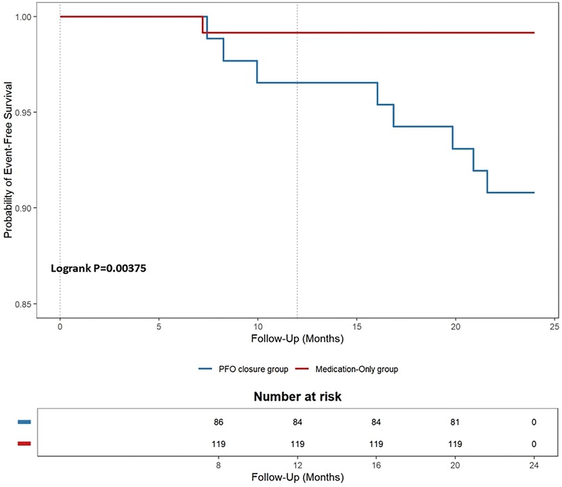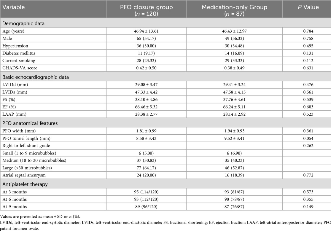 After PFO closure, most patients were treated with dual antiplatelet therapy (aspirin 100 mg/day or aluminum-magnesium aspirin tablets MG/day plus clopidogrel hydrosulfate tablets 75 mg/day) for 6 months and antiplatelet therapy alone (aspirin 100 mg/day) for a further 3 months. The patients in the medication-only group received dual antiplatelet therapy for 3 months followed by antiplatelet therapy alone. The participants were followed up regularly (1, 3, 6, 12, and 24 months) at a cardiology or neurology clinic, no episodes of atrial arrhythmias, atrial tachycardia, or atrial flutter were documented on ECG. The end points were recurrent PFO-related ischemic stroke, including ischemic cerebral embolism and transient ischemic attack (TIA), and death from any cause during the 2 years of follow-up. All suspected recurrent stroke cases were referred to an independent, blinded endpoint-assessment panel consisting of two neurologists and one radiologist. After reviewing brain-imaging files, discharge summaries and neurological examination reports, the panel discussed each event according to the diagnostic criteria for PFO-related stroke and reached consensus before it was included in the primary outcome. The definition of recurrent cryptogenic stroke is: after the first cryptogenic stroke occurs, another stroke event occurs, and after detailed etiological examination (such as imaging examination, cardiac monitoring, etc.), the specific cause still cannot be clearly identified (28).