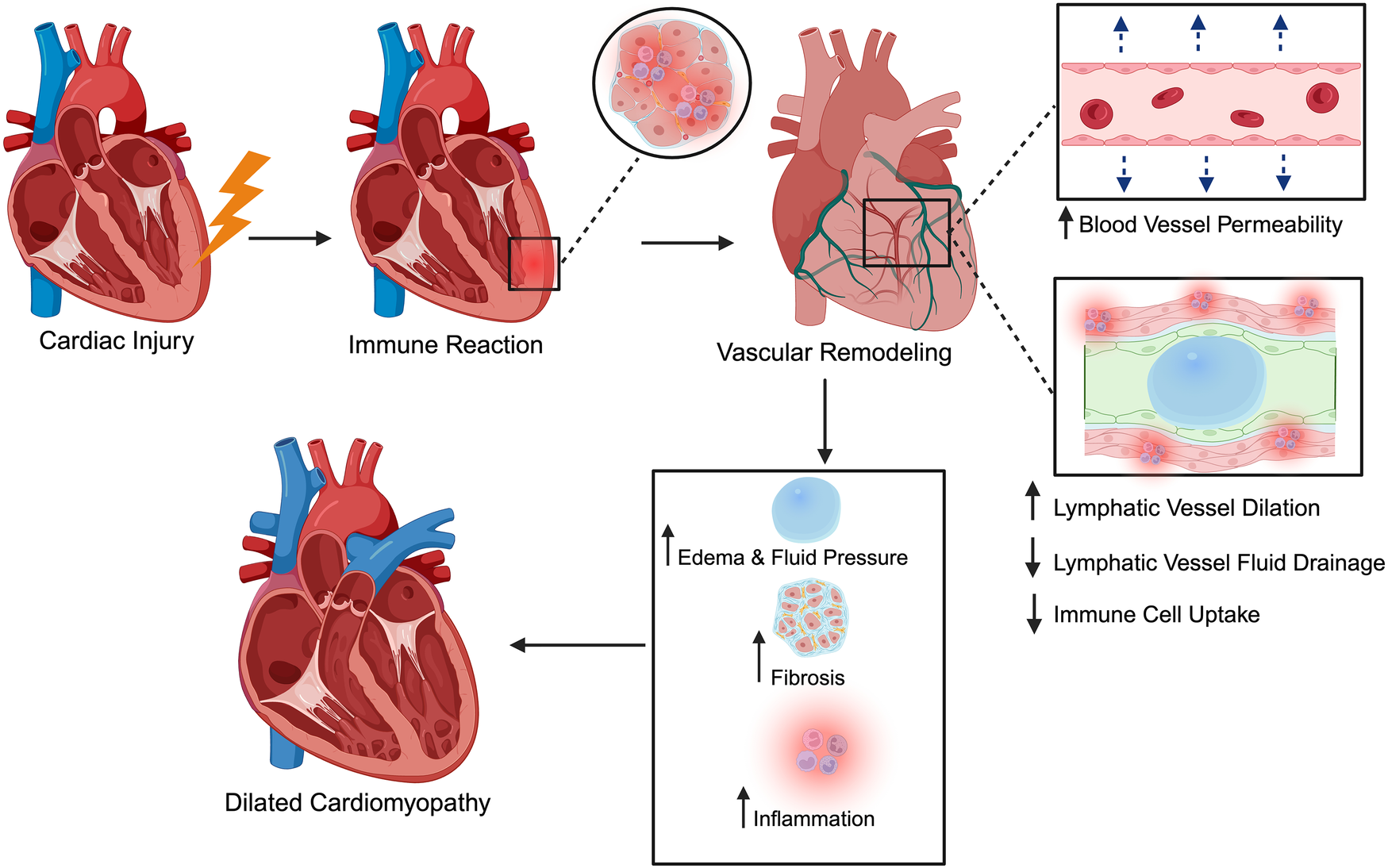 Schematic of myocarditis progression from acute injury to chronic disease. A variety of infectious and non-infectious triggers can cause initial cardiac injury. This leads to an immune and inflammatory response, causing vascular remodeling characterized by increased blood vessel permeability and disruption to lymphatic flow, impairing fluid drainage and immune cell trafficking. The resulting accumulation of interstitial fluid and inflammatory factors promotes fibrosis and ventricular dilation, ultimately progressing to conditions such as dilated cardiomyopathy. The figure was created using the illustration software on BioRender.com.