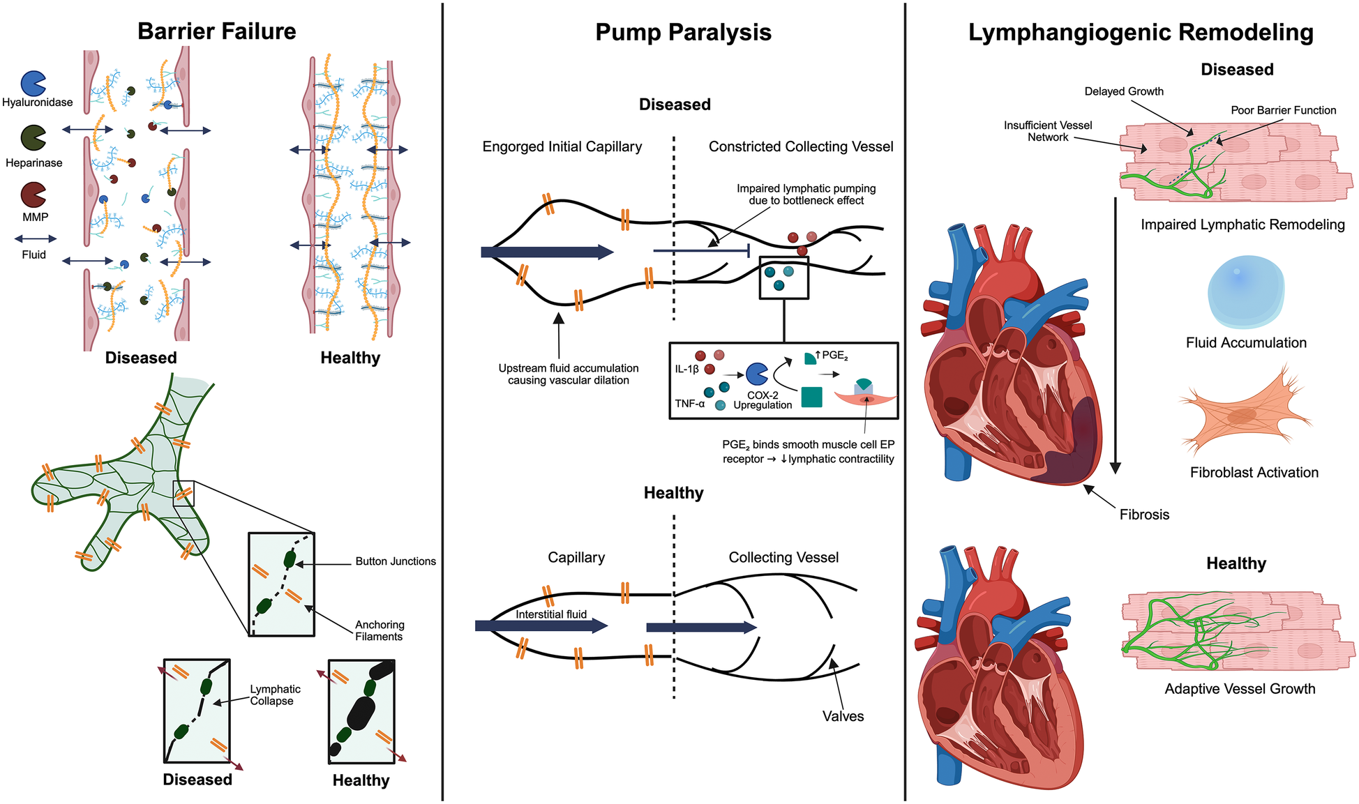 While the significant roles of the blood vasculature in myocarditis (increased capillary permeability, endothelial dysfunction, and inflammatory cell extravasation) have been well-established, the involvement of the cardiac lymphatic system remains less characterized in the pathophysiology of myocarditis (79, 83). During myocarditis, immune-mediated injury extends beyond blood microvasculature to the lymphatic network, unleashing a cascade that converts transient inflammation into persistent, edema-driven damage. In this section, we will outline three overarching processes which contribute significantly to this process: heightened lymphatic permeability; pump paralysis, in which cytokines such as IL-1β and TNF-α blunt intrinsic lymphangion contractility; and maladaptive remodeling, marked by capillary dilation, pre-collector narrowing, and loss of anchoring filaments that tether vessels to the ECM (Table 1). The net result is stalled clearance of interstitial fluid and pro-inflammatory mediators, escalating interstitial pressure, mechanically activating fibroblasts, and accelerating the transition to fibrosis and DCM. The subsections that follow will examine each step in greater detail.