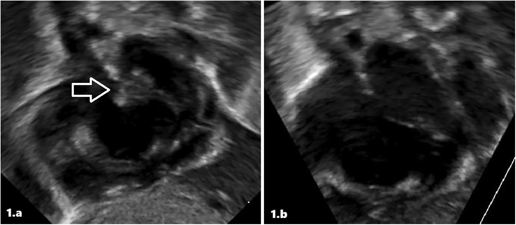 Intracardiac thrombus at diagnosis (a) and after treatment (b) in patient 1 at echocardiographic scans.