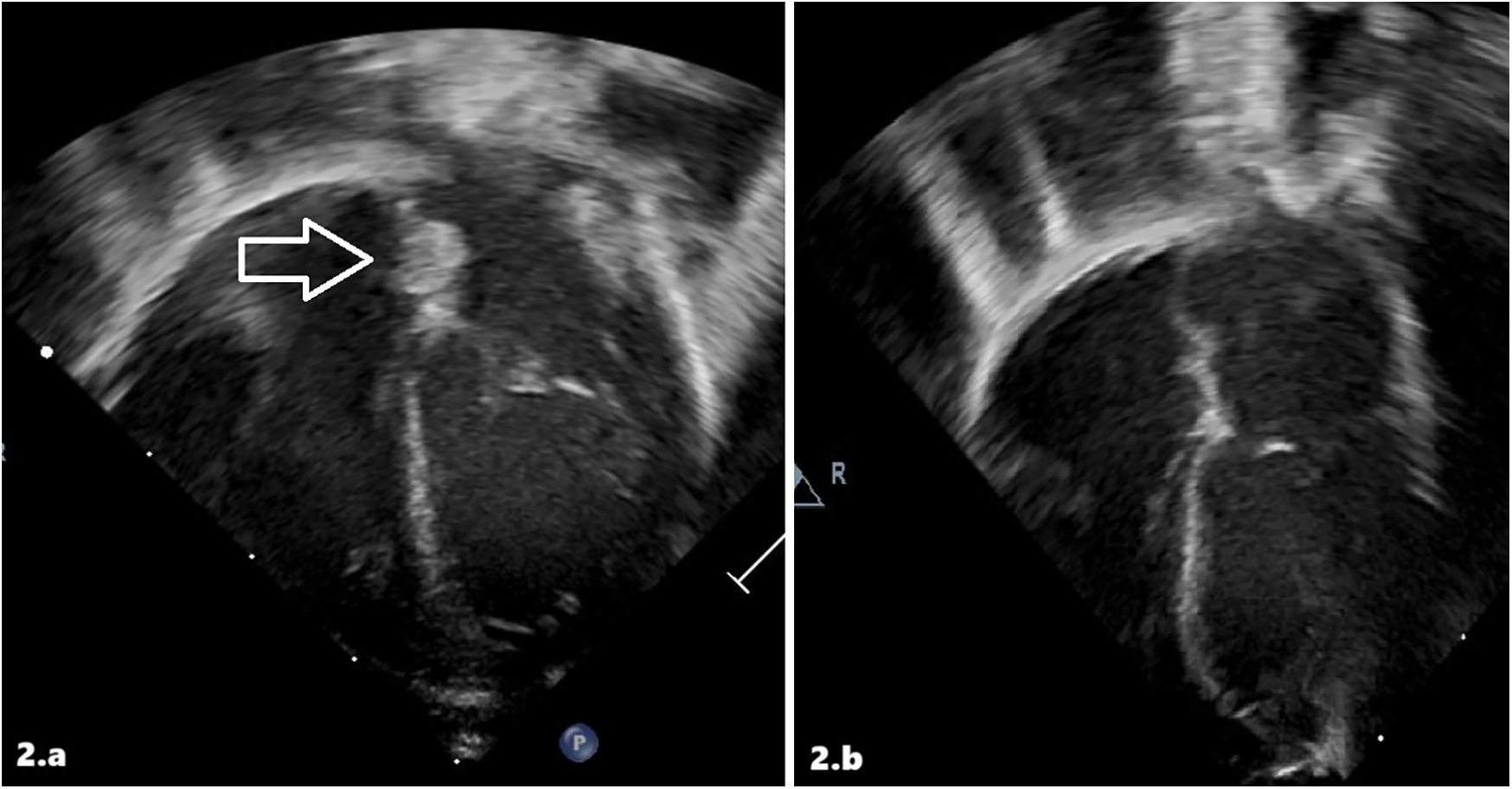 Intracardiac thrombus at diagnosis (a) and after treatment (b) in patient 2 at echocardiographic scans.