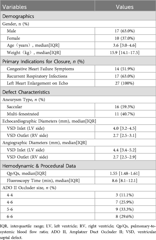 Results: Twenty-seven patients (median age 3.6 [3.0–4.6] years; median weight 15.9 [14.1–17.5] kg) were included. Defects had a median left ventricular inlet diameter of 4.0 [3.2–4.5] mm and right ventricular outlet diameter of 2.7 [2.5–3.1] mm; 59.3% were saccular aneurysms. The procedure was successful in 100% of cases using ADO II devices ranging from 4–4 to 6-6 mm. Median fluoroscopy time was 8.6 [8.1–12.1] min. No major procedural complications occurred. The immediate complete closure rate was 85.2%, rising to 100% at a median follow-up of 49 [28–72] months, with resolution of all clinical symptoms and no late device-related adverse events.