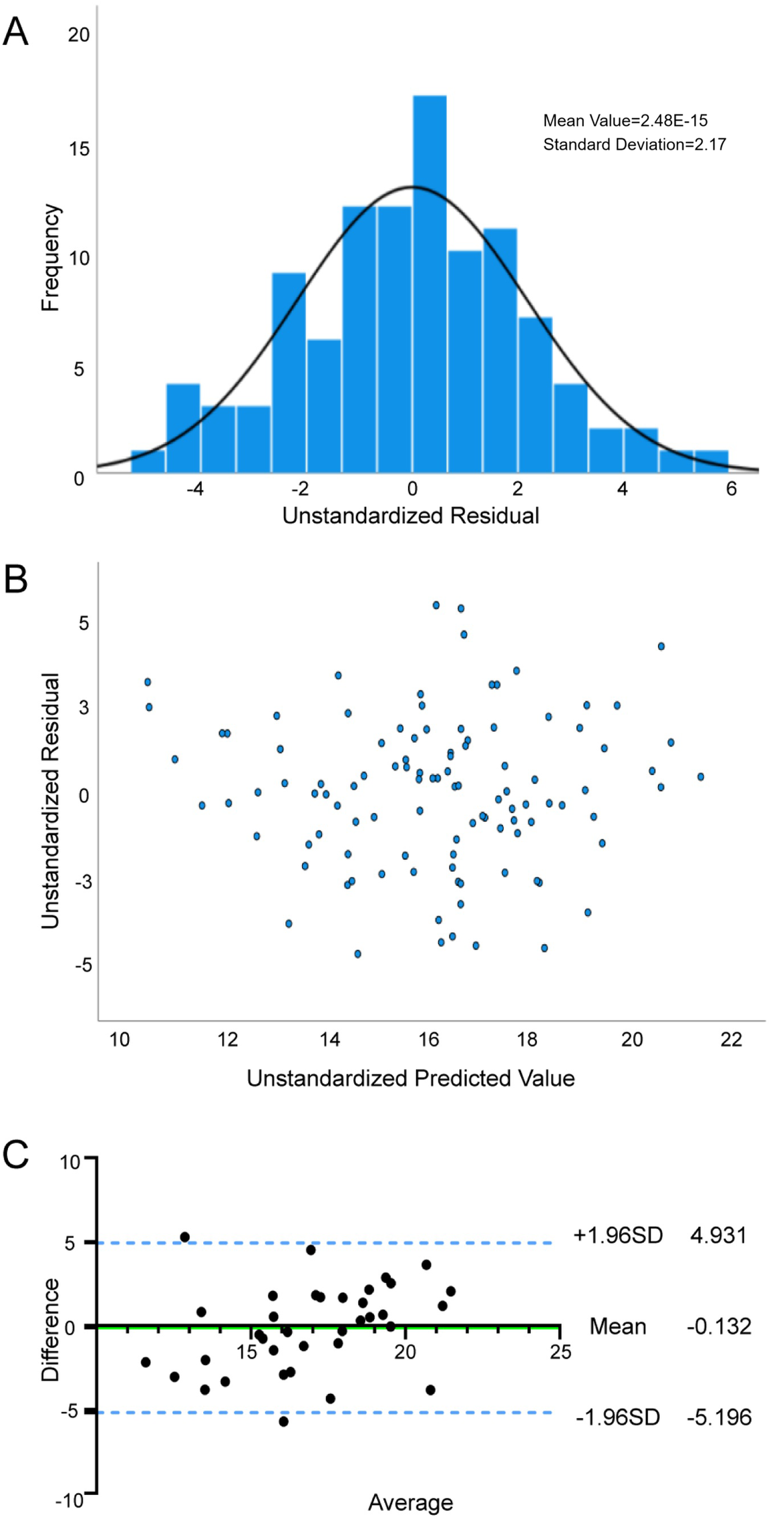 All statistical analyses were conducted using SPSS 25.0 (IBM Ink., Armonk, NY) under the supervision of a medical statistician expert. Normally distributed continuous variables were analyzed using Student's t-test, reported as mean ± SD. Non-normally distributed continuous variables were compared via the Mann–Whitney U test with median (Q1, Q3) presentation. Categorical variables were analyzed by the Chi—square (χ2) test, and the results were presented as percentages (%). Participants were randomly allocated into a derivation cohort (n = 105) and a validation cohort (n = 36) at a ratio of 3:1. Variables demonstrating statistical trends (P < 0.1) in the correlation analysis with VO2peak and METsmax were initially selected as candidate independent variables. Stepwise regression (forward entry α ≤ 0.05, backward retention α ≥ 0.1) was employed to develop the predictive equations. The robustness of the models was evaluated through multiple means. Normality was assessed using histograms of standardized residuals. Multicollinearity was examined by calculating the variance inflation factor (VIF), with a threshold of VIF < 5. Residual independence was evaluated using the Durbin—Watson statistic, with an acceptable range of 1.5–2.5. The goodness-of-fit of the models was determined by F-tests from ANOVA, and reported as adjusted R2. For internal validation, predicted and measured values in the validation cohort were compared using Pearson correlation coefficients and paired Student's t-test, with Bland-Altman agreement analysis to evaluate accuracy and systematic bias. For all analyses, P < 0.05 indicated statistically significant.