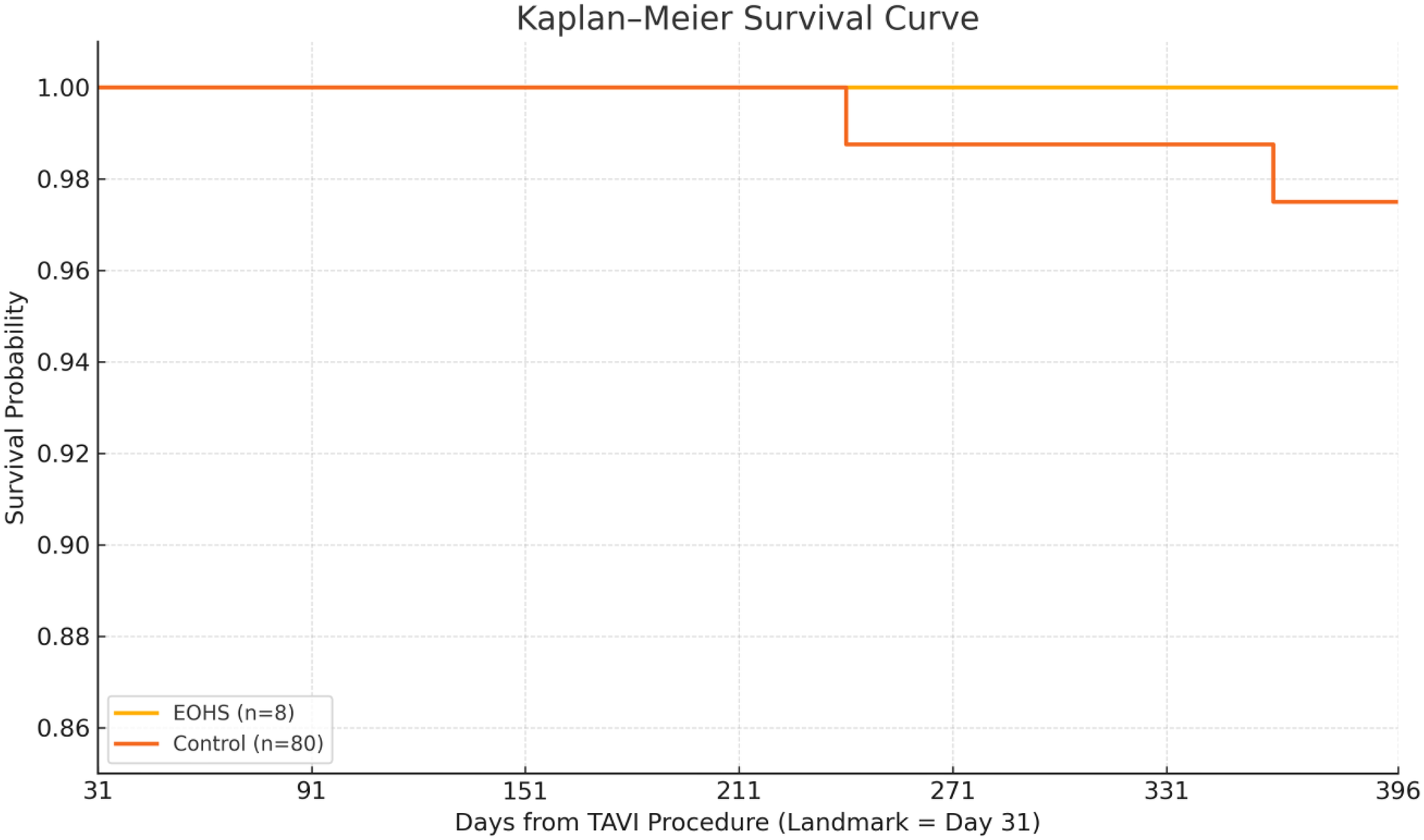 During 339 patient months of conditional follow-up, no E-OHS survivor died, whereas two control patients succumbed to their disease conditions—one died of septic shock 7 months’ post-TAVI, and the other died of progressive heart failure at 11 months. The Kaplan–Meier curve (Figure 1) displays near-complete overlap; the absolute risk difference at 12 months was −2.9% (95% CI: −9.3% to 3.5%). Log-rank p = 0.64; HR for death E-OHS vs. controls 0.33 (95% CI: 0.02–5.64).