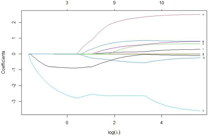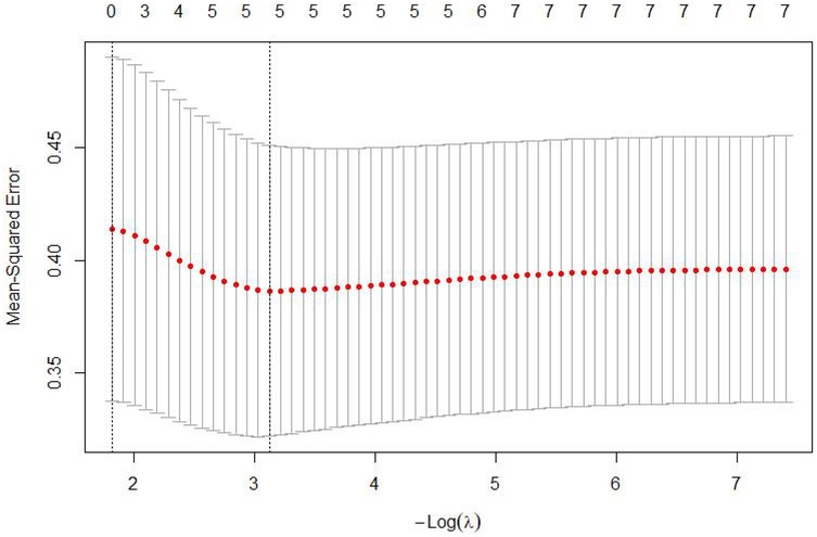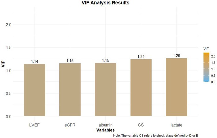 The 7 variables identified as statistically significant through univariate analysis were subjected to LASSO regression for dimensionality reduction and initial variable screening. A 10-fold cross-validation was employed to determine the optimal λ value, which minimized the cross-validation error. Variables with non-zero regression coefficients corresponding to the optimal λ value were further analyzed statistically. The LASSO regression results indicated a minimum error value of 0.044. At this point, the variables with non-zero regression coefficients were lactate, eGFR, LVEF, SCAI-CS stage, and albumin (Figures 2, 3). A variance inflation factor (VIF) test was conducted on the aforementioned 5 variables, and the results indicated no multicollinearity issues among them (Figure 4).
