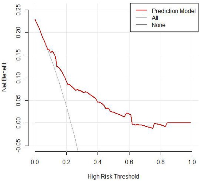 According to the DCA, this combined prediction model offers greater clinical utility when the risk threshold ranges from 0%–61% (Figure 6).