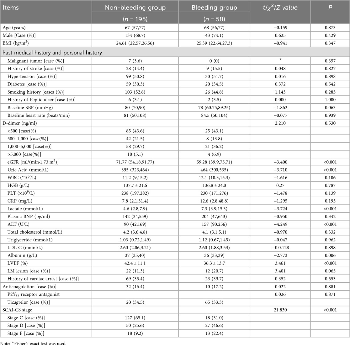 The univariate analysis indicated that the levels of uric acid, lactate, and ALT were higher in the bleeding group compared to the non-bleeding group. Conversely, the levels of eGFR, LVEF, and albumin were lower in the bleeding group. Additionally, the bleeding group exhibited a higher stage of SCAI-CS. All differences were statistically significant (P < 0.05) (Table 1).