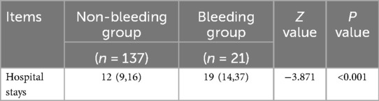 The results indicated that the in-hospital mortality rate for patients in the bleeding group was significantly higher than that of the non-bleeding group (29.7% vs. 63.8%), with a statistically significant difference (P < 0.05). Additionally, the duration of hospital stay for surviving patients in the bleeding group was significantly longer than that of the non-bleeding group (Table 3), and this difference was also statistically significant (P < 0.05).
