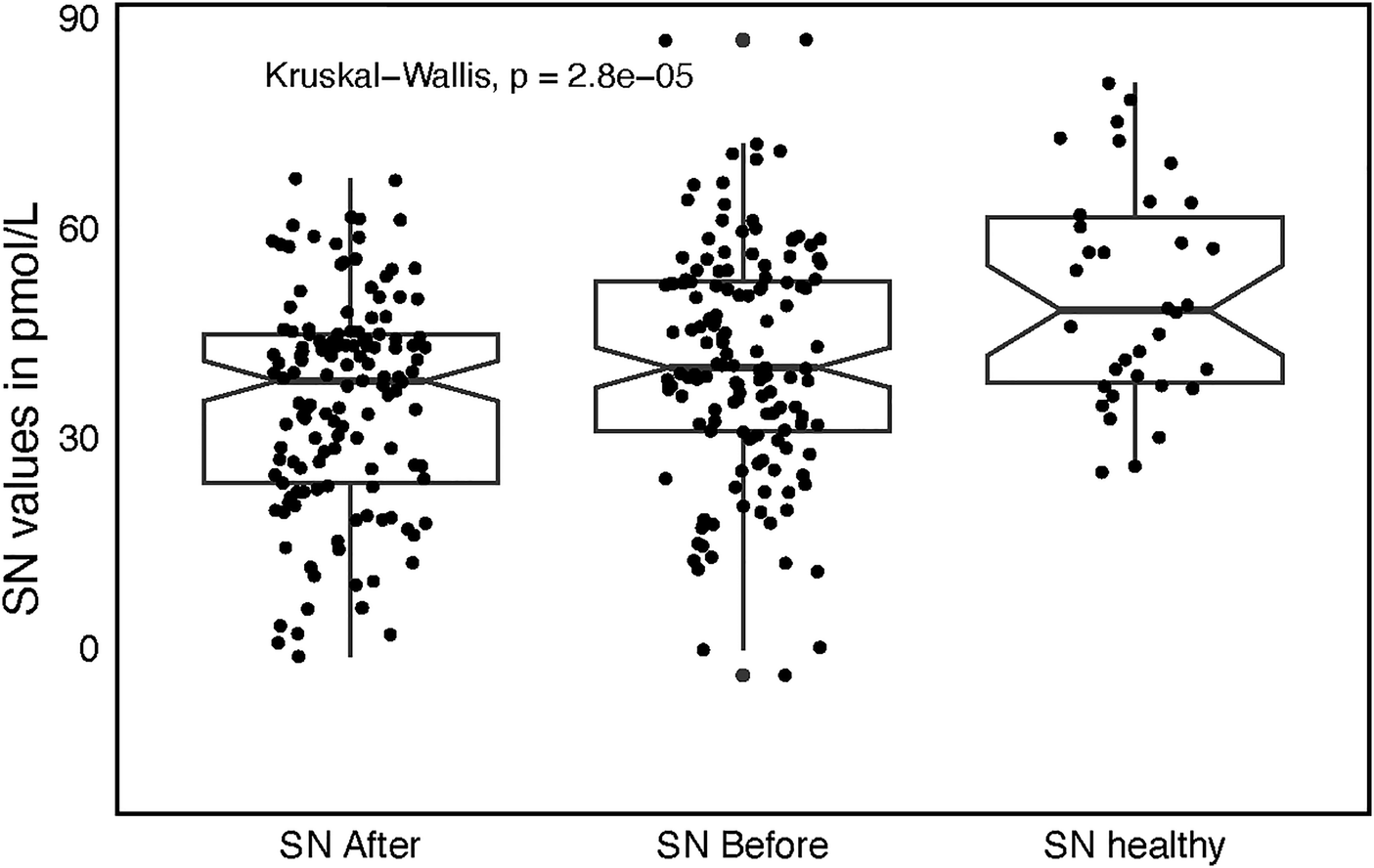 SN was analyzed from venous (arterial in case of the LA site) blood by use of the ELISA method (CardiNor AS, Oslo, Norway) (7). The blood was drawn into lithium–heparin tubes, and the plasma was separated and frozen to −70°C; only one defrosting cycle was allowed. The intra-assay coefficients of variation for SN were lower than 5% and the interassay coefficient was lower than 10%. The level of determination (LoD) for the CardiNor SN is 5.1 pmol/L, the level of quantification (LoQ) is 7.6 pmol/L, and the analytical range is 11.8–299.2 pmol/L.