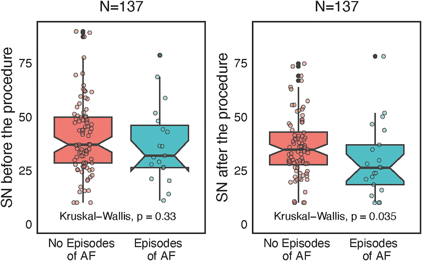 Furthermore, lower postprocedural levels of SN were associated with AF recurrence (p = 0.035, Figure 4). A 5 pmol/L increment of postprocedural SN decreased 0.9× the risk of AF recurrence (OR 0.93, 95% CI 0.74–1.3, P = 0.049). There were no meaningful differences between the AF recurrence and nonrecurrence groups except for body weight and height (Supplementary Table 1). The C-statistic for SN after the procedure to separate the presence or absence of AF recurrence was 0.65 with bootstrap 95% CI 0.5–0.8. The cutoff value assessed by the Youden index was 34.7 pmol/L, the sensitivity 54%, and specificity 68%. A postprocedural value higher than 34.7 pmol/L increased the chance of staying in sinus rhythm, but both the sensitivity and specificity were very low. Therefore, postprocedural SN had limited predictive capacity regarding the AF recurrence, which was confirmed by the strict univariate logistic regression model, where was only trend towards it's predictive capacity in relation to AF episodes (see Supplementary Material). Postablation AF episode rate was 25/137 (18.2%) in the whole group, but 18/95 (18.9%) in the paroxysmal AF subgroup and 7/42 (16.7%) in the persistent AF subgroup. After the blanking period of 90 days the AF recurrence rate was 9/95 (9.5%) in the paroxysmal AF subgroup, no recurrencies were observed in the persistent AF subgroup.