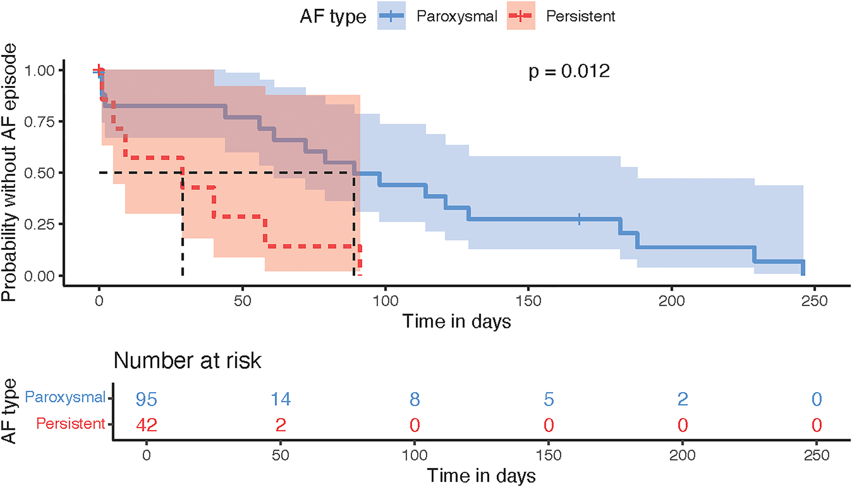 Kaplan–meier time-to-event analysis plot displaying the comparison of paroxysmal vs. persistent AF according to the probability of AF episode.