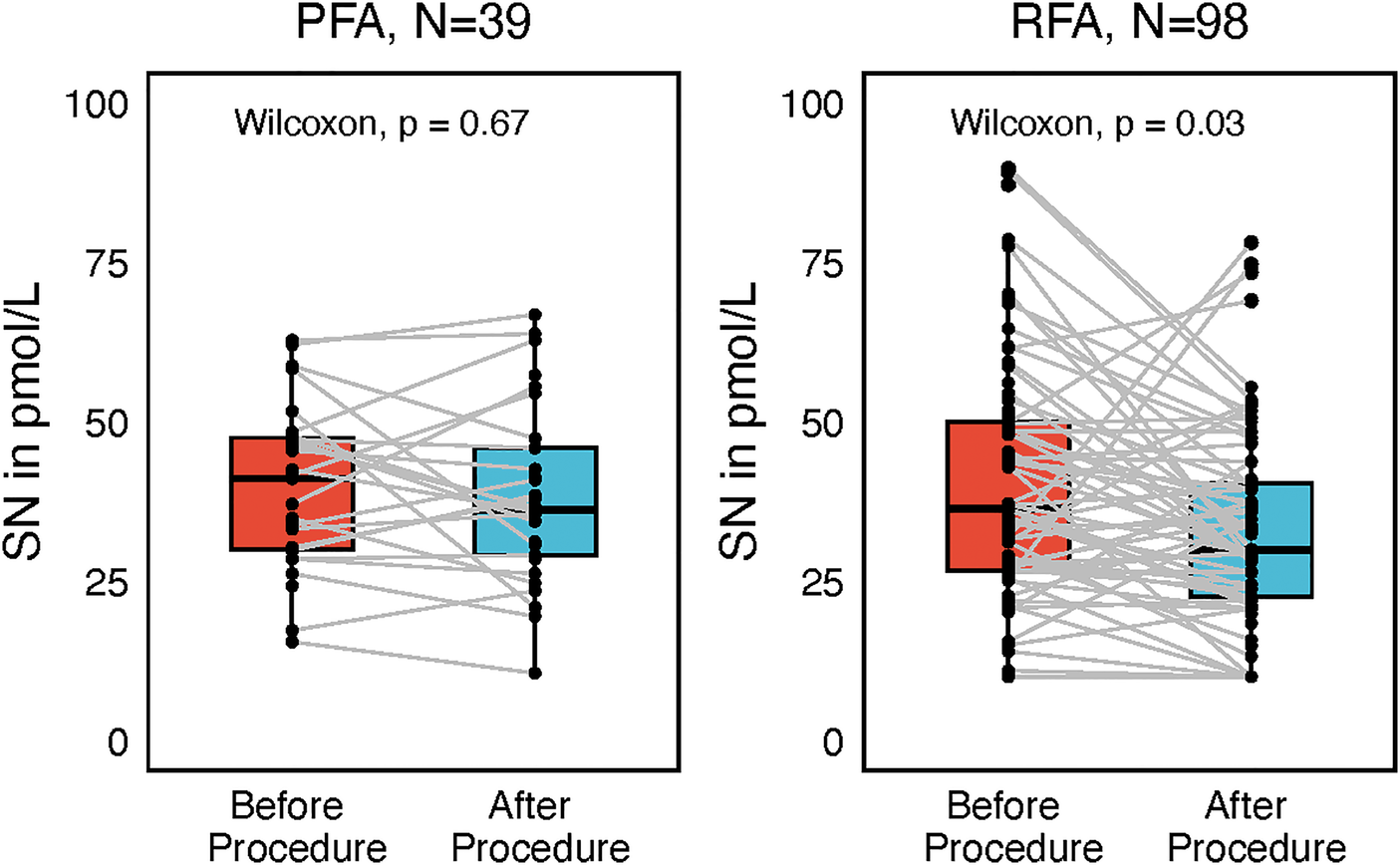 AF episodes were somewhat higher in the paroxysmal AF, but the time to episode was longer than in persistent AF (P = 0.012, Figure 5). Subgroup analysis by ablation modality showed a difference in plasma SN levels before and after ablation only in the radiofrequency subgroup (P = 0.03, Figure 6), although this could have been caused by the significantly smaller sample size of the PFA group (N = 39) since numerically the SN values were also lower post procedurally; however, this difference did not reach statistical significance. Furthermore, the RFA group differed from the PFA group in several variables including age, body weight, AF recurrences, total procedural time, and other factors (Supplementary Table 2).