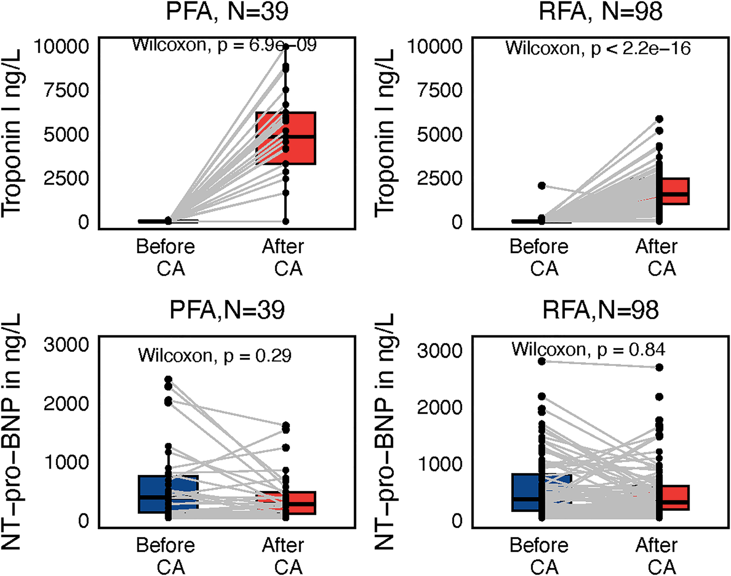 Subgroup paired Wilcoxon test of troponin I and NT-proBNP values reflecting ablation modality, either pulsed-filed ablation (PFA) or radiofrequency ablation (RFA), before and after the procedure with interconnecting lines between values before and after.