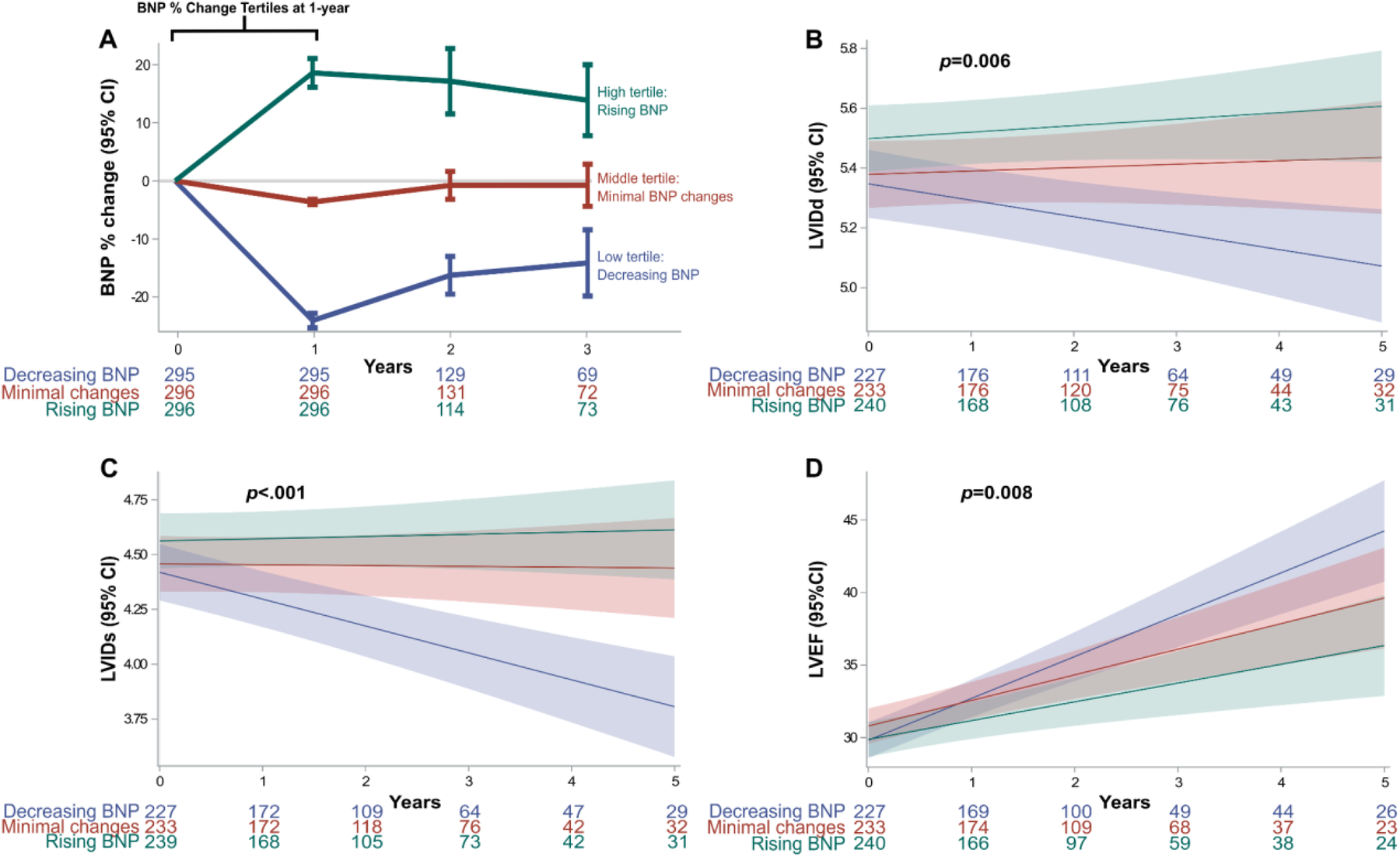 BNP tertile changes and co-primary endpoints. (A) Absolute BNP percent change at one-year from baseline: The first year was used to categorize groups based on BNP percent change tertiles. (B–D) Co-primary outcomes assessing echocardiographic LV geometry and function showed long-term changes between the BNP change groups. Mixed linear model showed significant differences in LVIDs (p < 0.006), LVIDd (p < .001) and LVEF (p < 0.008). BNP, brain natriuretic peptide; LV, left ventricular; LVEF, left ventricular ejection fraction; LVIDd, LV internal dimension at end-diastole; LVIDs, LV internal dimension at end-systole.