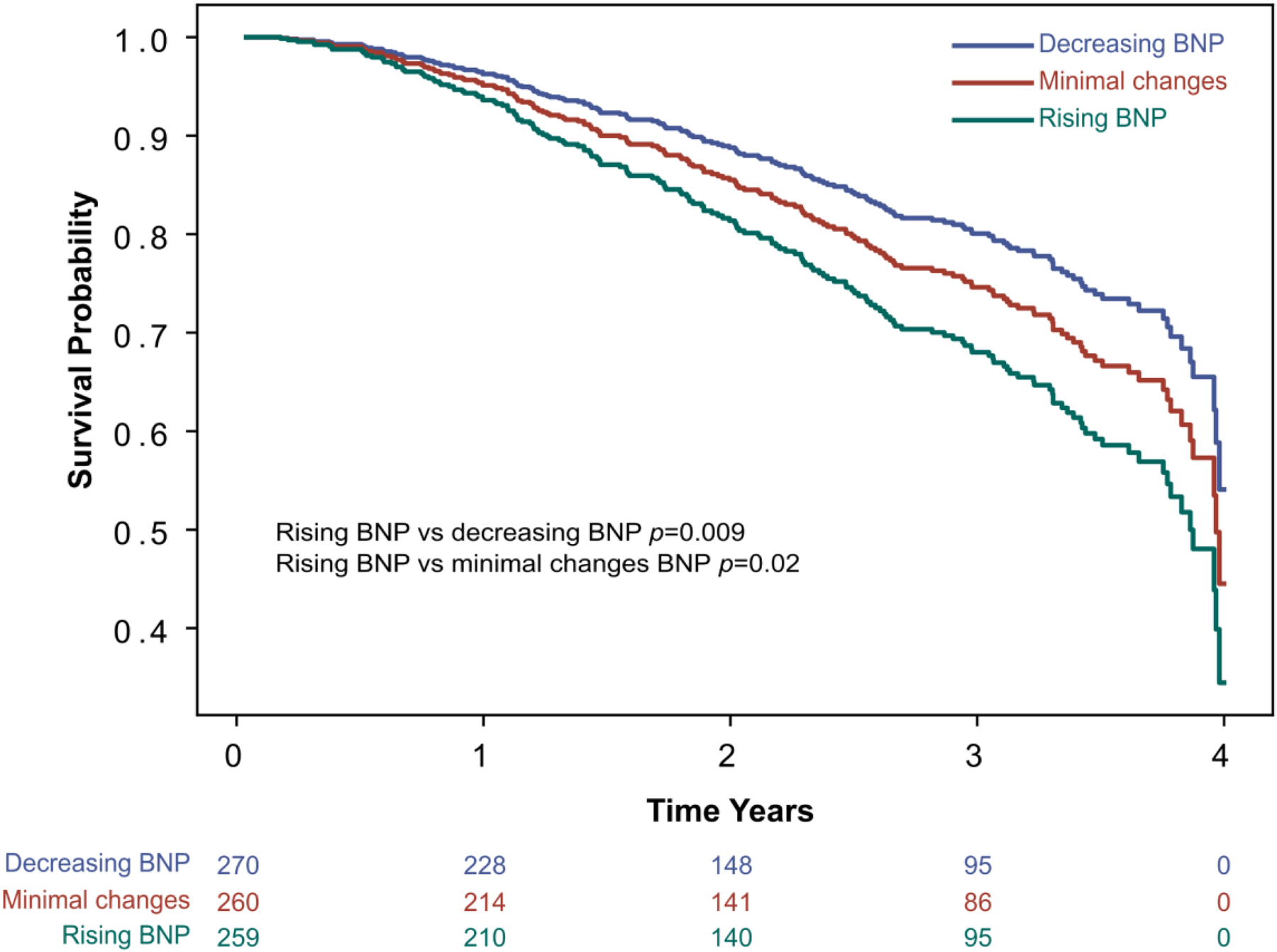 A total of 887 patients were included. Baseline characteristics, including age, sex, blood pressure, atrial fibrillation, baseline BNP, and LVEF, varied among tertiles (p < 0.05). When comparing to the rising BNP tertile, the decreasing BNP tertile showed decreased trends of LVIDs (p = 0.001), LVIDd (p = 0.006); and increased trends of LVEF (p = 0.008). All-cause mortality was higher in the rising BNP tertile (p < 0.05) compared to the decreasing tertile.