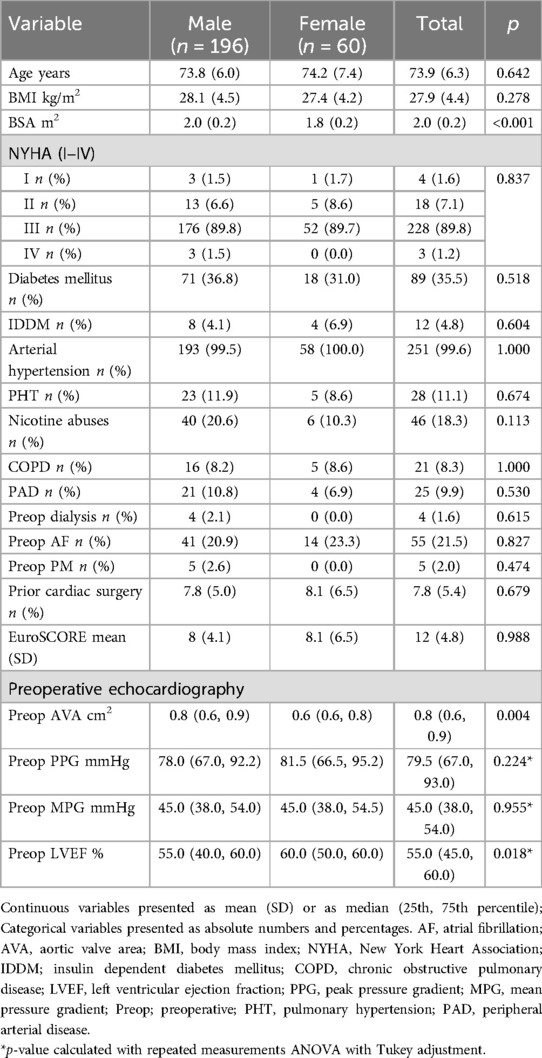 A total of 256 patients who underwent isolated or combined SAVR with the Edwards Intuity valve system were included in this analysis, comprising 196 males (76.6%) and 60 females (23.4%). With exhibition to body BSA (male vs. female: 2.0 ± 0.2 m2 vs. 1.8 ± 0.2 m2, p < 0.001) preoperative demographic data, clinical variables and comorbidities did not significantly differ between males and females Table 1. Despite these differences, the preoperative risk as assessed by European System for Cardiac Operative Risk Evaluation (EuroSCORE) was comparable between males (8% ± 4.1%) and females (8.1% ± 6.5%) (p = 0.988) (Table 1).