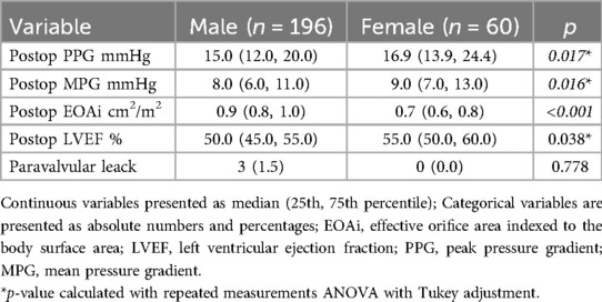 Postoperatively, LVEF remained lower in males than in females [50% (45, 55) vs. 55% (50, 60), p = 0.038, respectively]. The PPG and MPG were significantly higher in females compared to males (p = 0.017 and p = 0.016, respectively) Table 3. The EOAi measured postoperatively was smaller in female than in male [0.9 (0.8, 1.0) cm2 vs. 0.7 (0.6, 0.8) cm2, p < 0.001, respectively] (Table 3). The incidence of paravalvular leak did not differ between males and females [3 men (1.5%) vs. 0 women, p = 0.778].