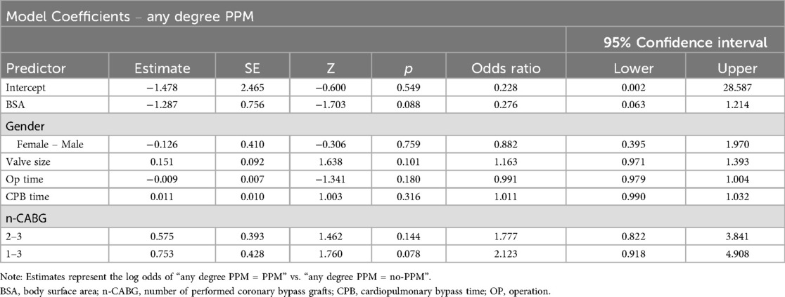 After entering all variables with a p-value <0.05 in the univariate analysis (gender, BSA, valve size, CPB time, operation time and the number of performed coronary bypass grafts) (Table 7) into a multivariate logistic regression with the variable any degree PPM as the dependent variable, none of the variables remained an independent predictor for PPM.